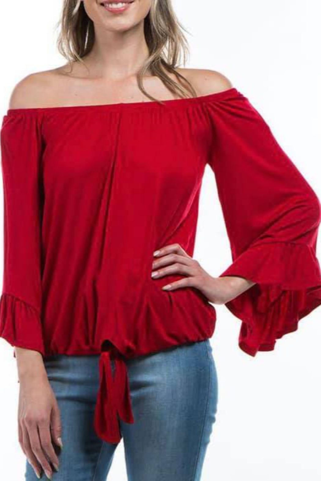 This beautiful yet comfortable off shoulder top has a flare ruffle long sleeve with a loose banded bottom and a tie front. Pair this shirt with your favorite jeans to complete the look. Shirt runs true to size