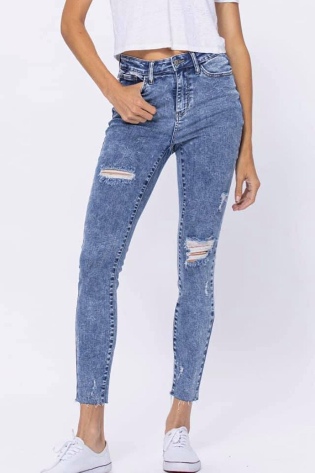 Hi-Rise Skinny Acid Wash Destroyed Hem Jeans