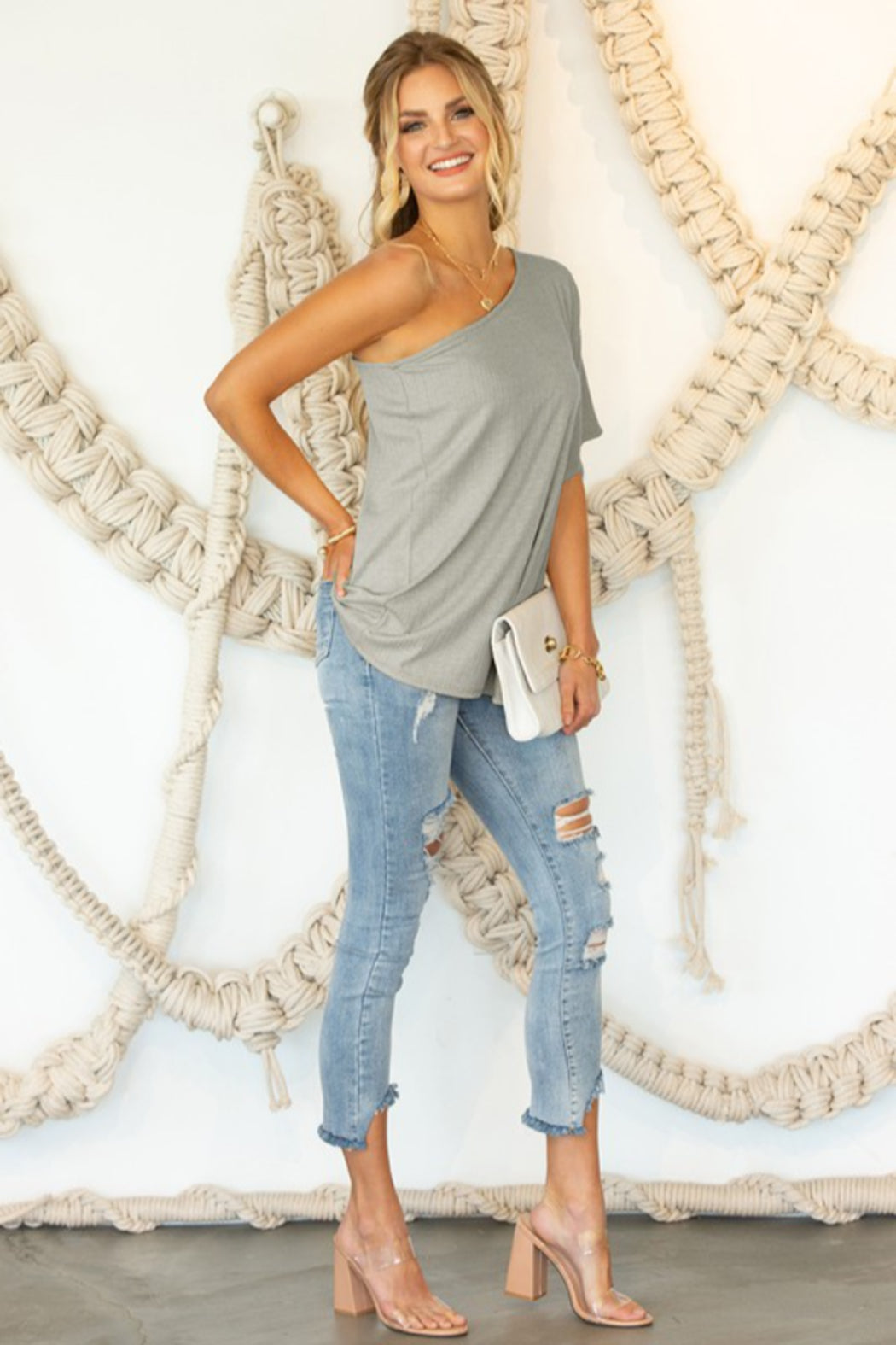 One shoulder drape top. Featured in a pointelle fabric with loose fit silhouette. This shirt is great with denim capris or jeans.