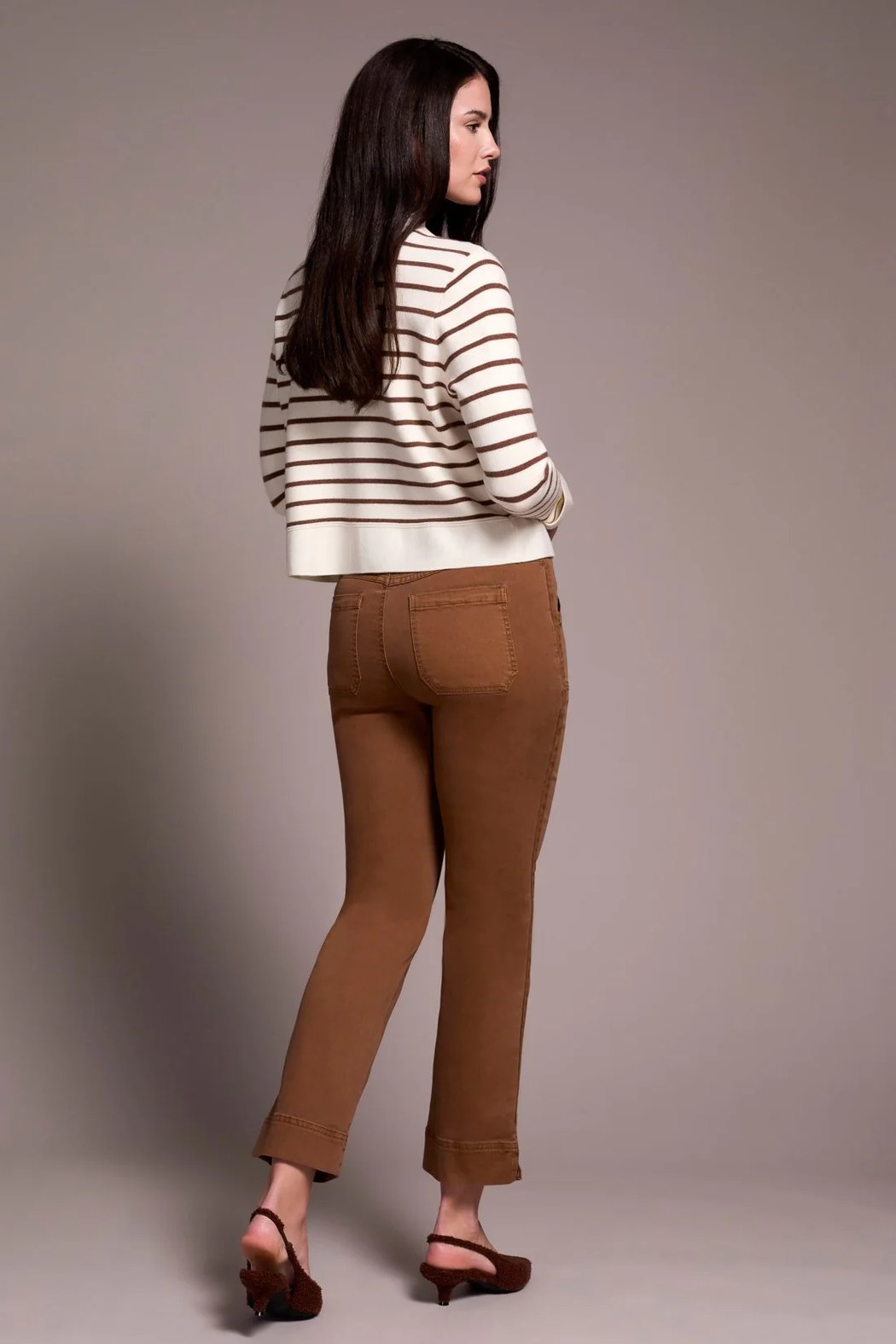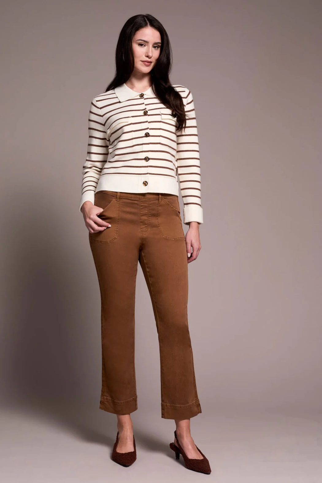 Complete your look with a polished touch in this cozy cardigan, featuring a playful stripe pattern and a refined collar. The double-knit jacquard fabric offers warmth, while accent chest pockets add a charming, functional detail.
