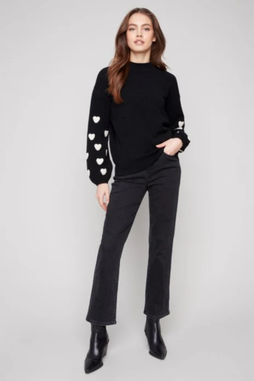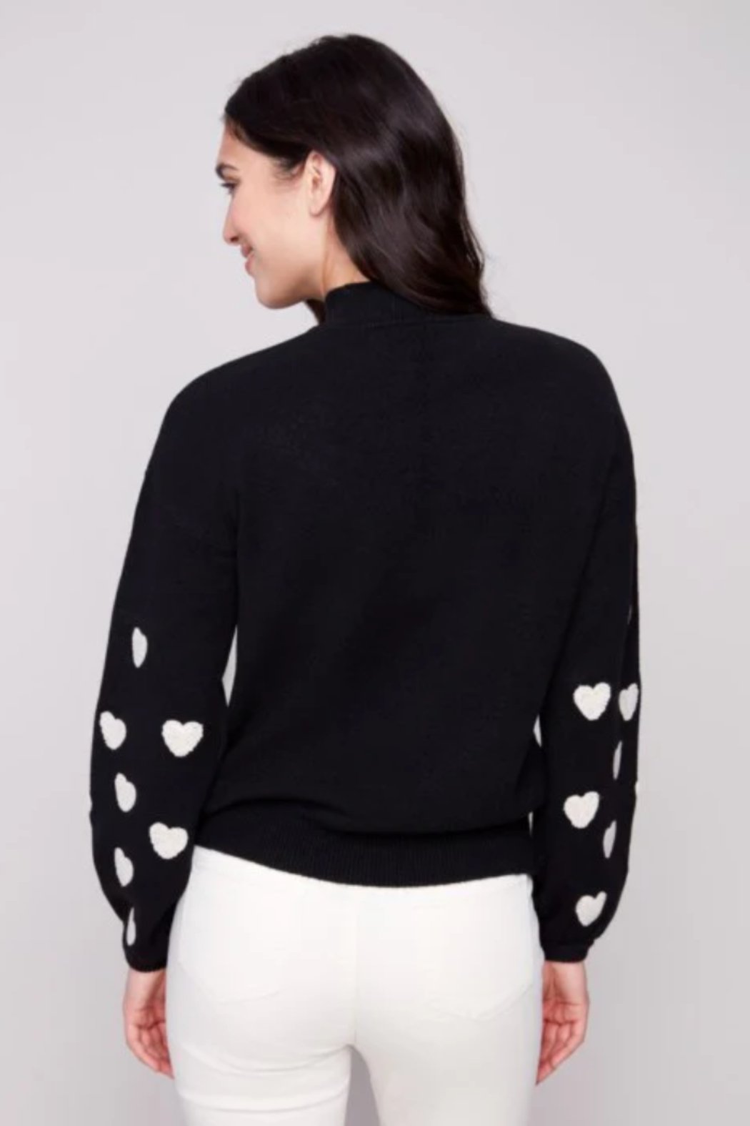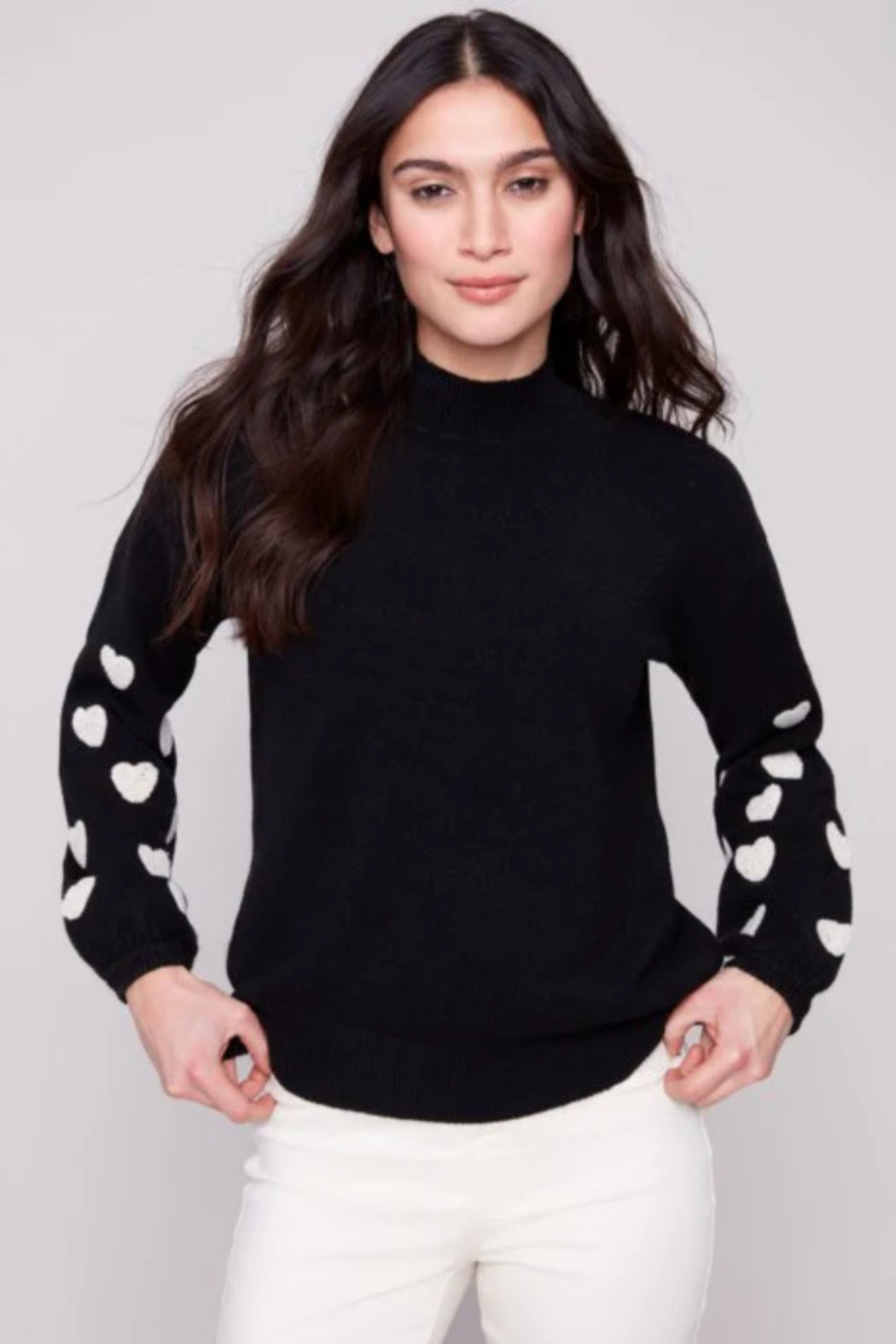 Mock Neck Drop Shoulder Sweater with Boucle Heart Embroidery on Sleeves