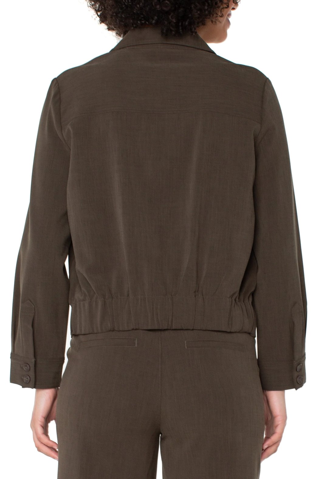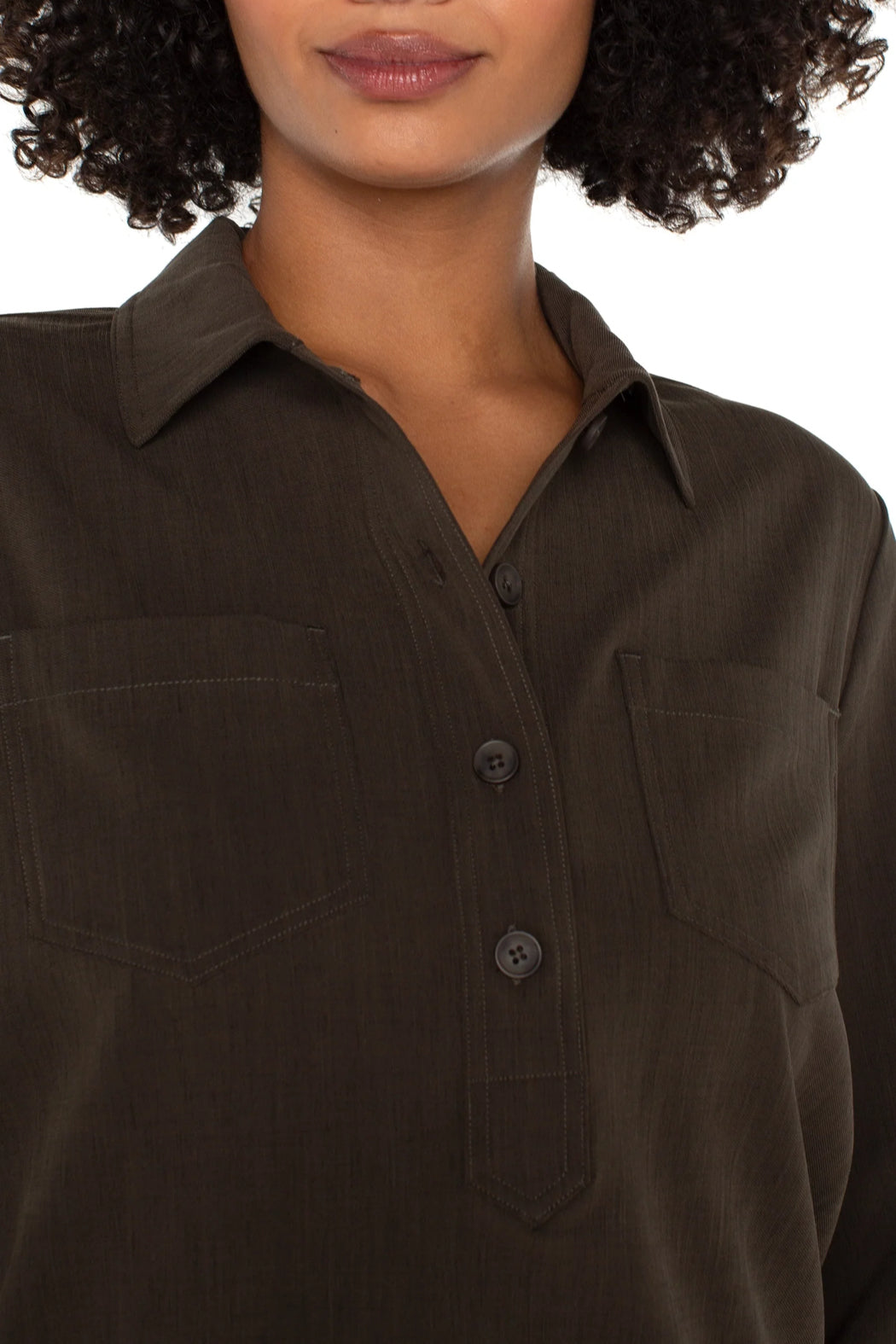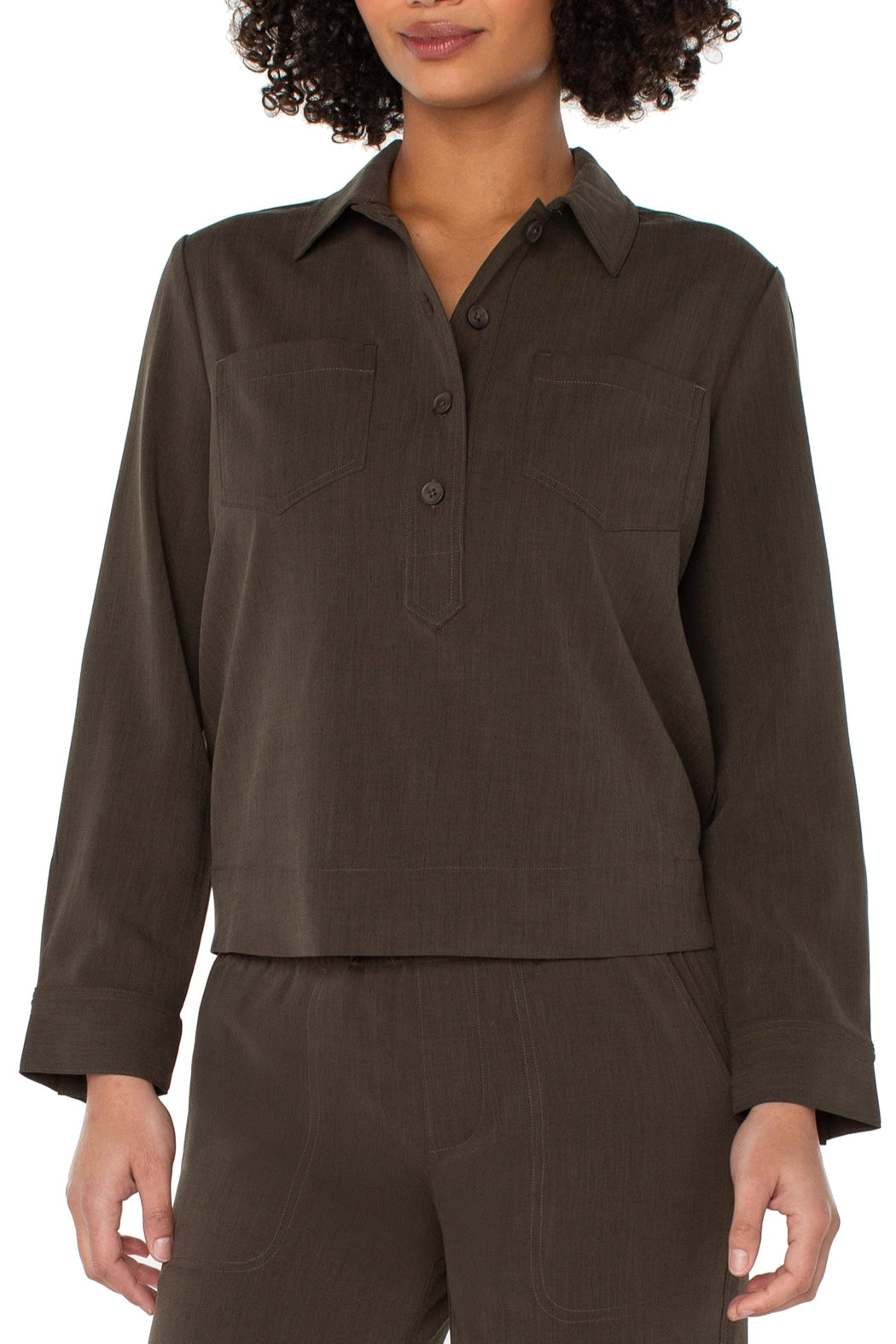 This popover shirt features a four-button neckline and an elasticized back waist for a gently cinched shape. Designed in a rich black olive hue, it strikes the perfect balance between laid-back and pulled-together. Pair it with the matching wide-leg pant for a head-to-toe look, or mix it with denim for effortless contrast.
