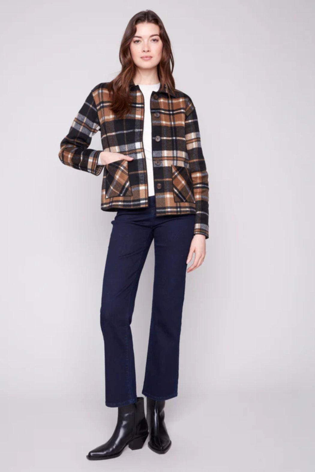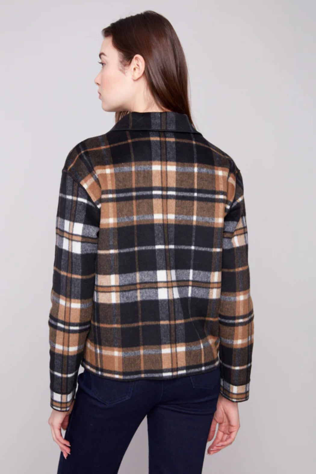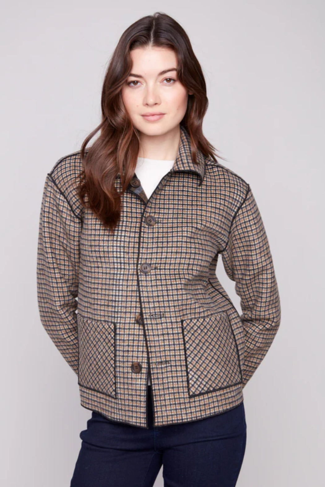 Meet your new favorite jacket! This reversible plaid jacket provides two stylish looks in one. The rich cacao brown colour scheme brings warmth to any ensemble. With a button front closure and patch pockets, it's both practical and perfect for the fall season, effortlessly combining fashion with function.