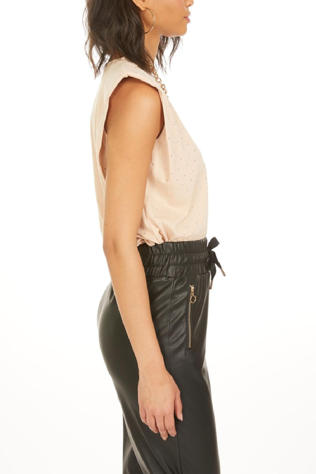 Meet Lex: an 80s muscle shirt-inspired tank with strong shoulders, thanks to its inserted pads. Its subtle all over tonal crystal detailing makes this everyday piece easy to style with sleek denim or flirty skirts for an unapologetically confident look. Hand wash, lay flat to dry or professional dry clean. Relaxed Fit. Modeled in an XS.