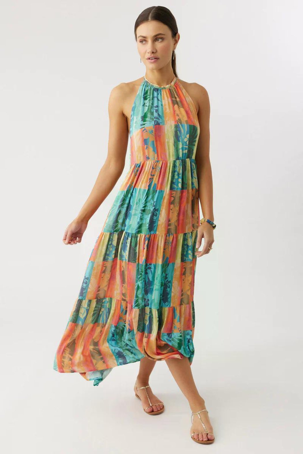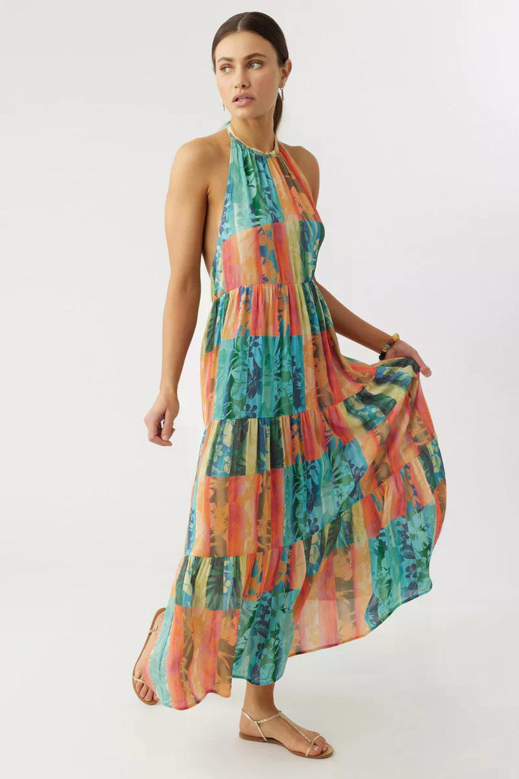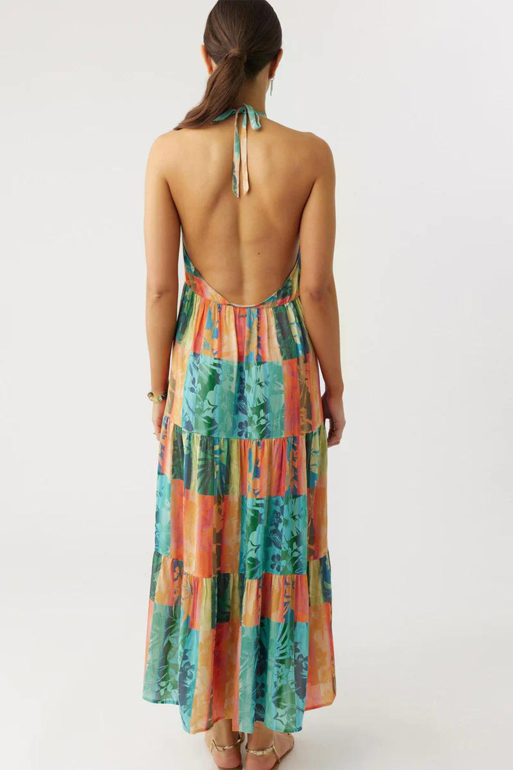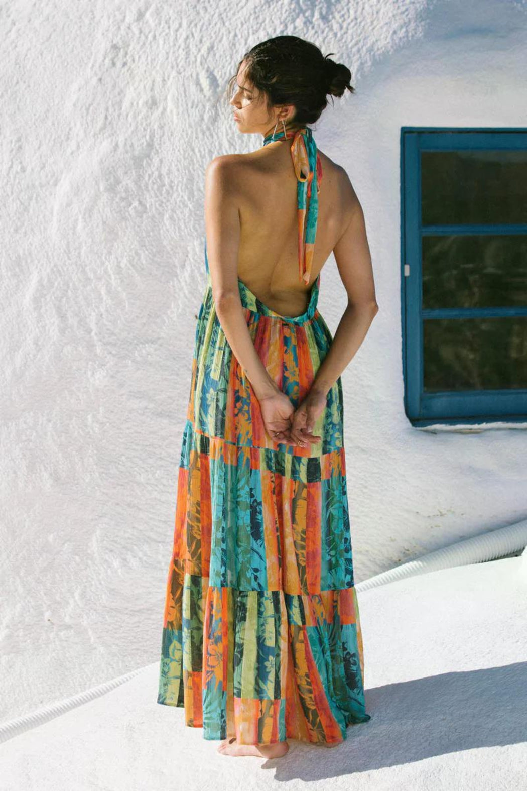 Radiate style and grace in this colorful woven maxi. It has a high neck design, low-back detail and ties behind the neck.
