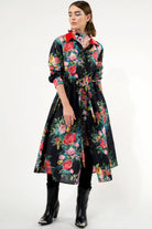 This black floral midi dress features a colorful floral pattern, a red velvet collar, pockets, cinched waist with beadwork as a tassel and bronze buttons. Unlined. This can also be styled as a duster. Model is wearing a size small.