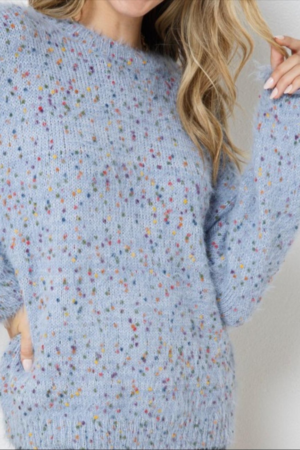 This baby blue sweater is perfect for Winter or Spring. It features colorful yarn confetti throughout. Model is wearing a size small.