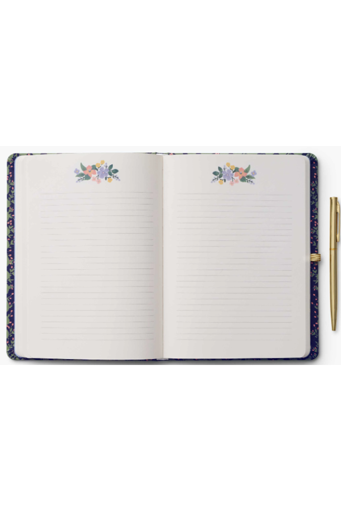 Designed for note takers and journalers, this hardcover journal comes with a gold pen with black ink, and features 144 ruled pages, an elastic band, and a pocket for extra storage. 8" L × 5.875" W