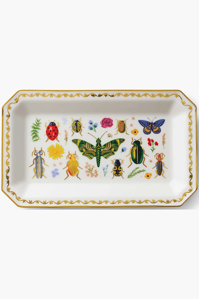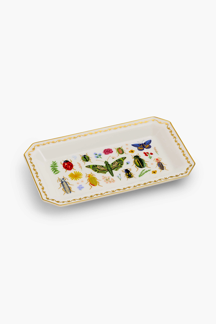 Keep track of all your trinkets with our large catchall tray, perfect for collecting mail, keys, or jewelry. This dish features the beetles, bugs, and flowers of our Curio print, with gold accents and a gilded rim for extra shine.