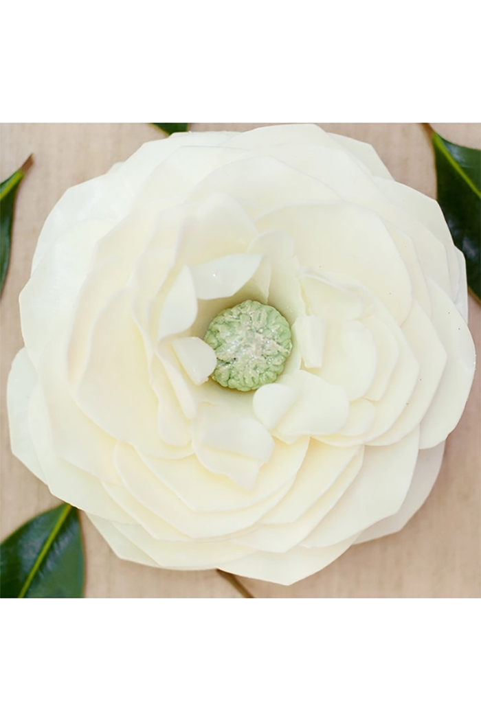 A warm white magnolia crowned with a olive green soap center. Fragrance: Magnolia. Each flower's petals offers 300 hand washes or 35 full body cleanses plus a bar of soap at the bottom of flower. Pull one petal that lasts approximately 10 hand washes or use for a full body cleanse, or shave. Enjoy petals for tub soaks. Comes with a petal stand to dry petal on. Made of goat's milk and shea butter soap that's luxuriously moisturizing. Classic white gift box with description, story, directions, and tissue paper inside. 5x5x3.5 Ingredients: Saponified Vegetable oils mainly Coconut Oil, Glycerine (kosher, vegetable origin), Shea Butter, Goat's Milk, Purified Water, Sorbitol (from berries), Sorbitan oleate (from vegetable source), Soybean protein, Titanium Dioxide (mineral whitener), Phthalate-Free Fragrance