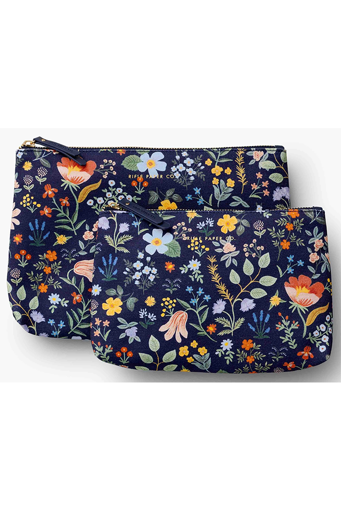 A set of two cotton canvas pouches featuring Rifle's timeless Bramble Fields floral. The pouches are spacious and lightweight, great for travel, organization, or tossing in your everyday bag.
