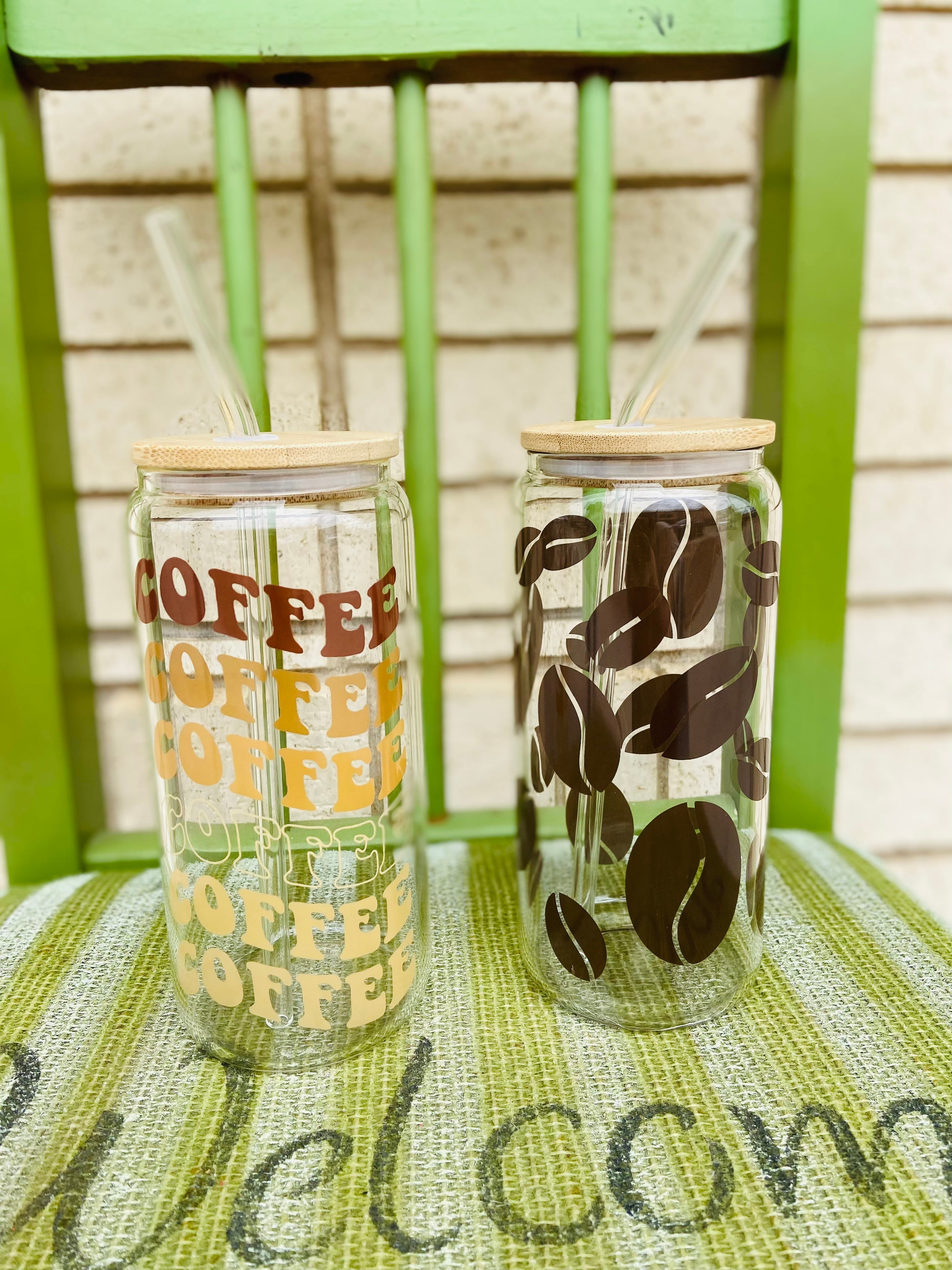 13834 Glass Cold Coffee Tumbler w/ Glass Straw - Coffee Print Pattern