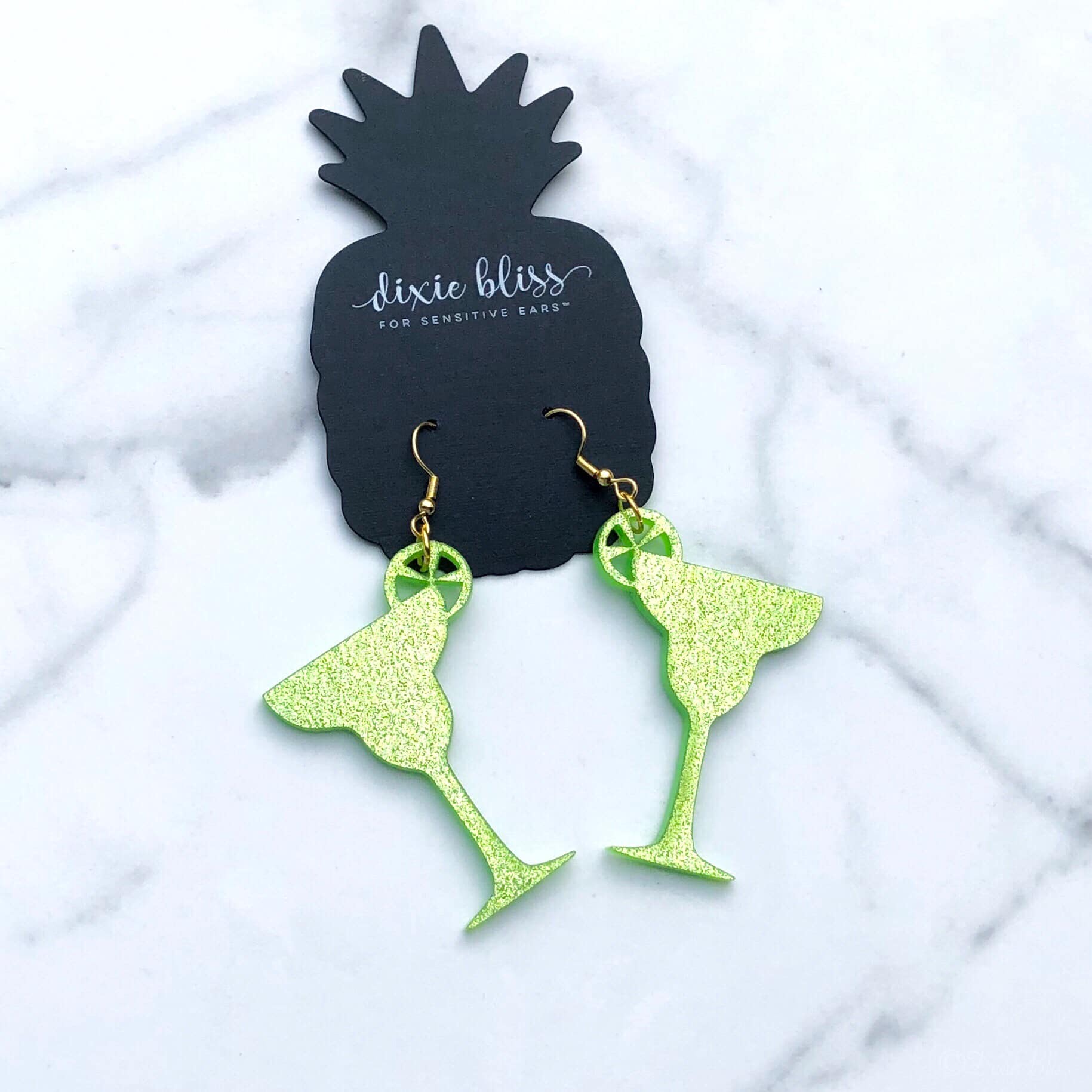 This fun Margarita Measures 3" from the top of hook, and is lightweight, featuring Lime Glitter Acrylic. Hooks are Gold Tone Stainless Steel, great for sensitive ears!