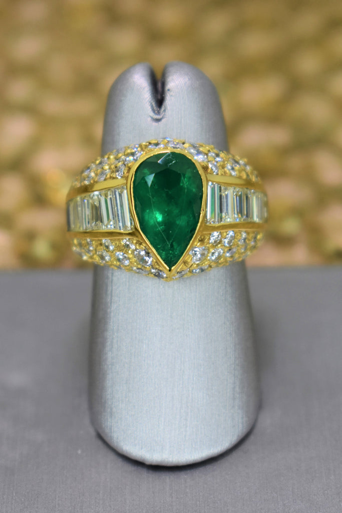 14kt Yellow Gold Pear Shaped African Emerald (2.39ct) Ring accented with Baguette & Round Diamonds (3.84cttw).