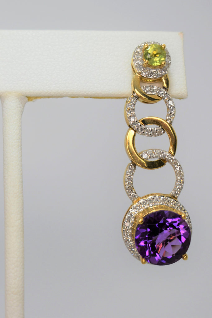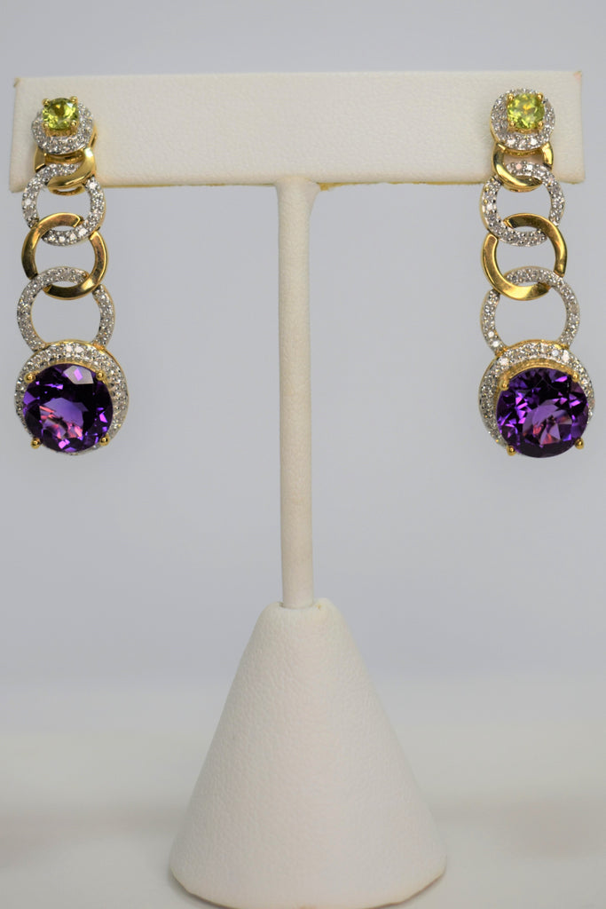 14kt Yellow Gold Peridot, Amethyst (5.00cttw) & Diamond (1.50cttw) Earrings.