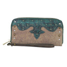 CATCHFLY LAUREN, WALLET WITH WRISTLET, TAN WITH METALLIC CANVAS AND BLACK PYRAMID EMBOSSED TRIM, 2 OPEN SLIT POCKETS, 1 ZIPPERED POCKET, 8 CC SLOTS 7 1/2" X 1" X 3 3/4"