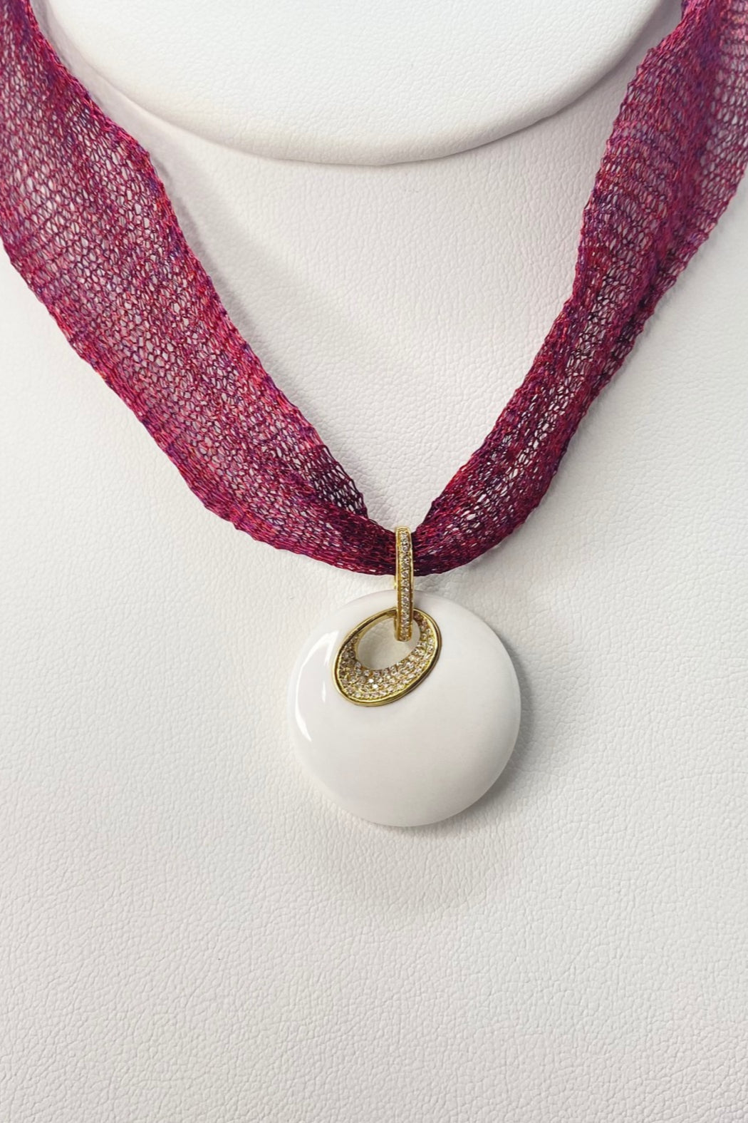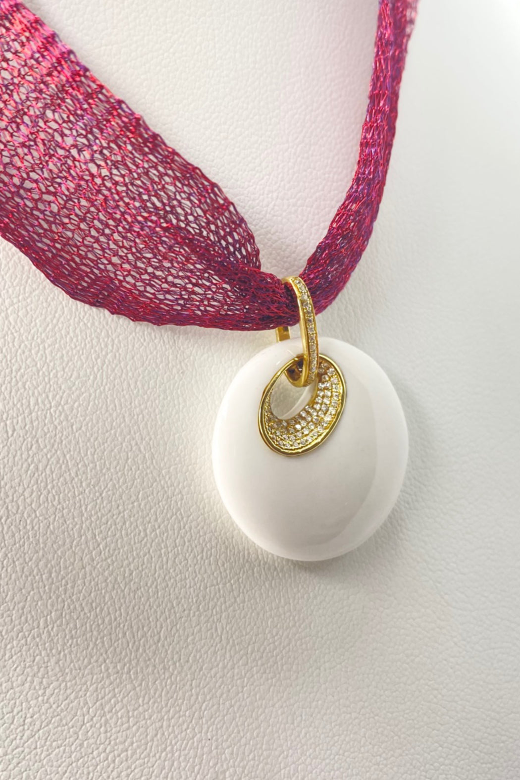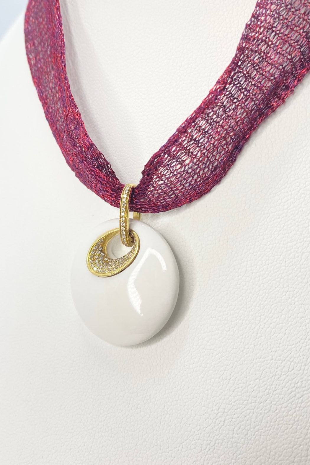 PAD707507 Italian made 18kt Yellow Gold White Agate & Diamond Pendant displayed on a titanium mesh chain by Designer Shoshana Gol. Titanium mesh can be purchased separately.