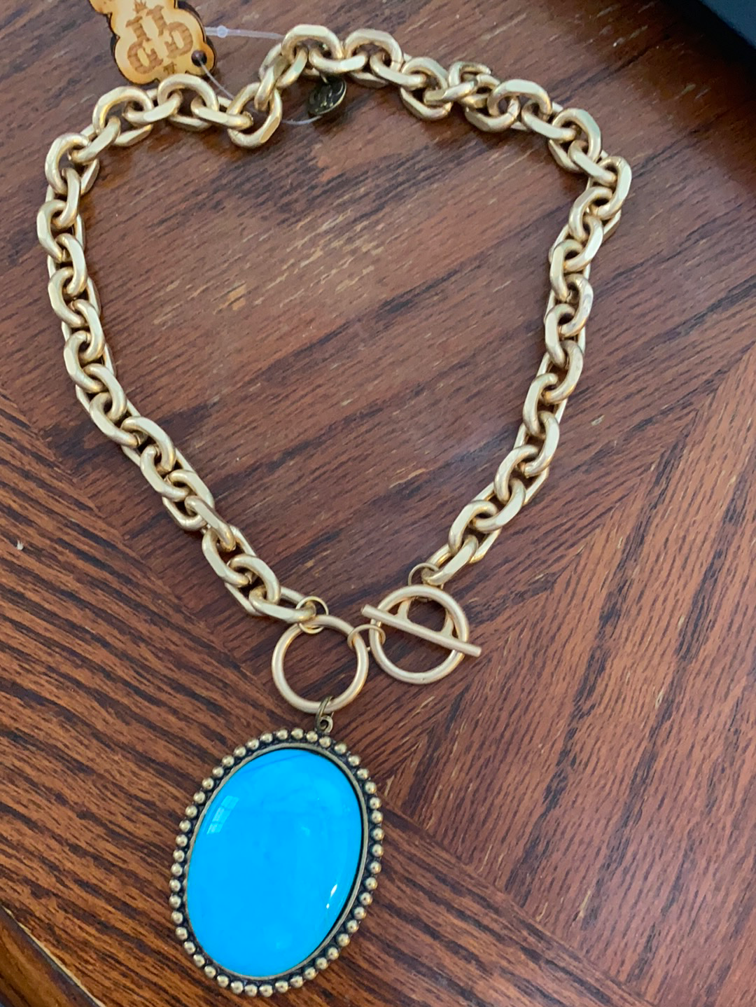 Large bronze oval turquoise cabochon pendant on matte gold front toggle chain
