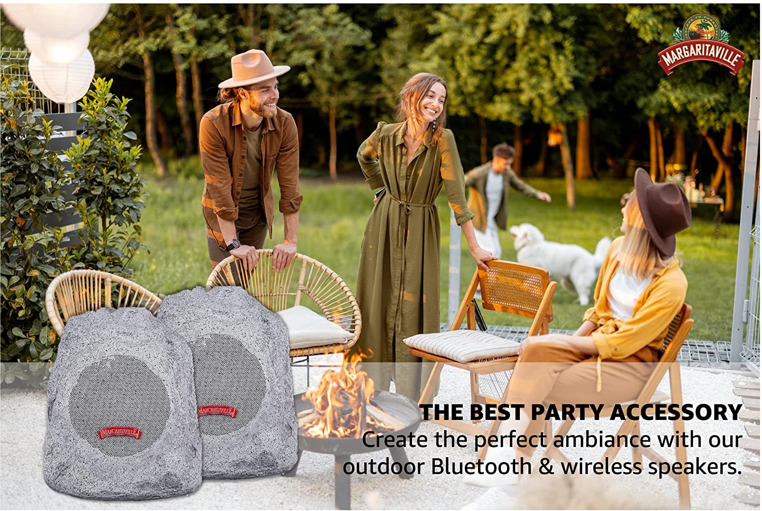Margaritaville “On the Rock” loud bluetooth speakers give you easy-to-use outdoor speakers bluetooth users can utilize as outdoor home theater speakers to create their very own high quality bluetooth surround sound system. With a Bluetooth range of 30 feet and True Wireless Pairing compatibility, these outdoor bluetooth speakers waterproof give you the freedom to make the decorative yard or patio speaker system of your dreams!