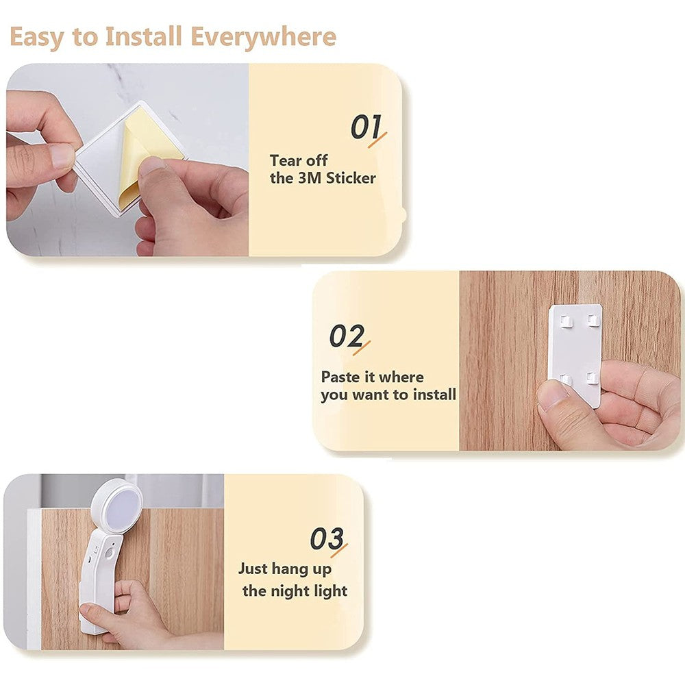 - Easy to Install on AnywhereThe night light feature a compact design with a base, and with a double-sided adhesive pads to enrich its usage scenarios.it can stand on any flat surfaces or stick on the wall. No Hammers, drills, or tools required . You can install anywhere you want.