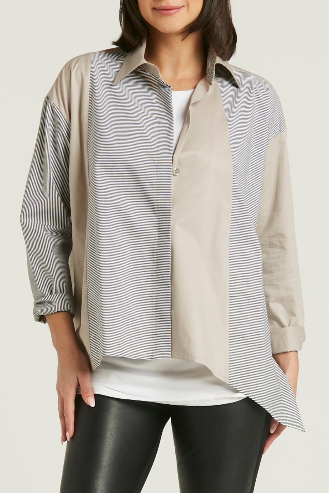 Asymmetrical mixed wonder! Our cool button-down is always most chic at the brunch or the game table. A versatile mix of solid and stripes makes it oh so modern. Be prepared to get compliments in any combo you choose!