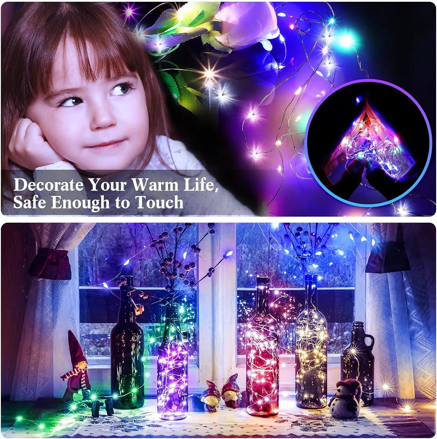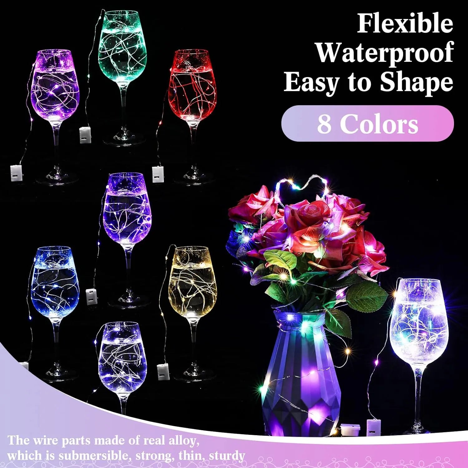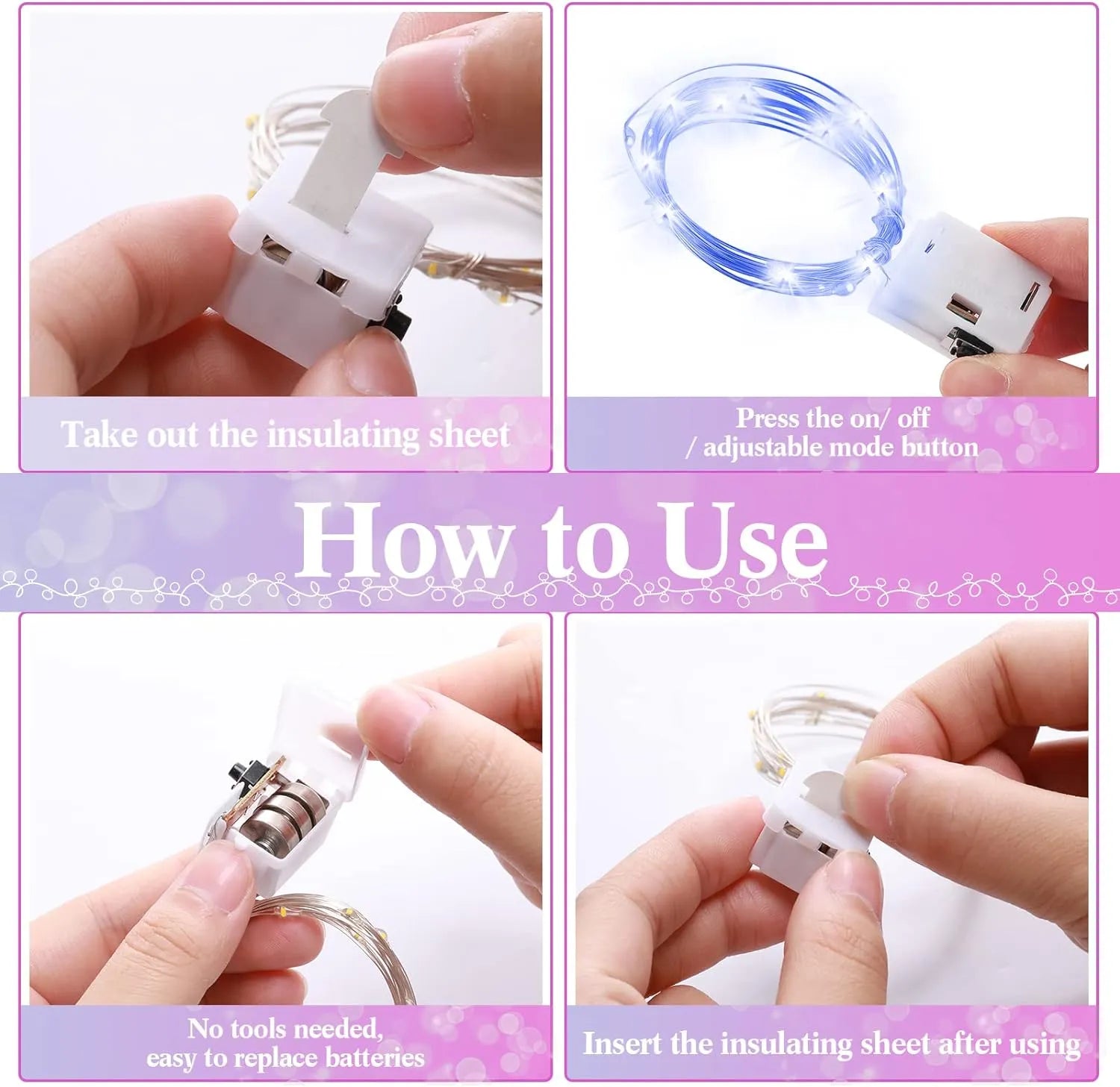 Fairy Lights Strips: 8 colors (each includes 3 button batteries), 20 LED lights on 7-foot long string cable; Enough length and quantity to satisfy a large number of party decorations, adding a romantic atmosphere to weddings, Christmas, Halloween, Thanksgiving, birthday parties, night parties, etc., 3 speed modes: the battery-operated fairy lights will shine in 3 modes, taking out the insulating sheet before use, press the button on the battery case to turn on the light, 3 modes to choose from: always on, fast flashing or slow flashing, to meet your different needs, insert the insulating sheet after use, as the button is easy to touch, safe and waterproof: mini fairy lights are made of LED bulbs, Alloy wire fairy lights are low power, insulated and safe, do not overheat and stay cool after long hours of use, stay safe to the touch, can be submerged in water to create a wonderful scene, and can be applied indoors and outdoors The warm light strip is battery operated to help create a good atmosphere for each common item, the flexible cable can be easily built into the shape you want to decorate children’s bedrooms, windows, painted walls, patios, gardens, balconies, bars, café, flower shops, shopping malls and much more.