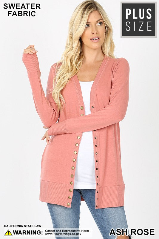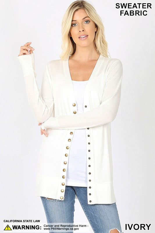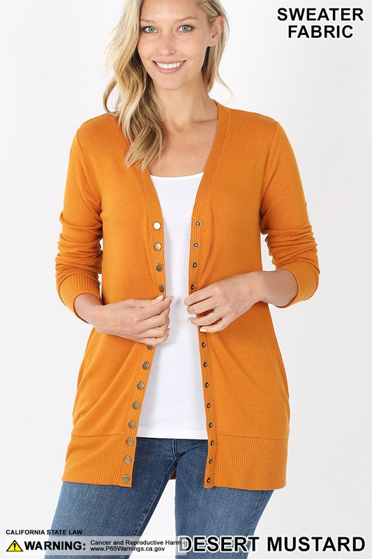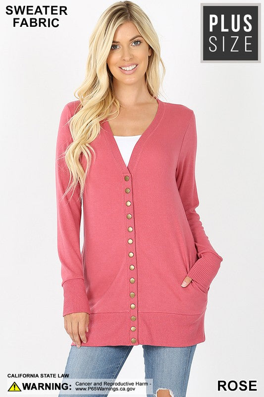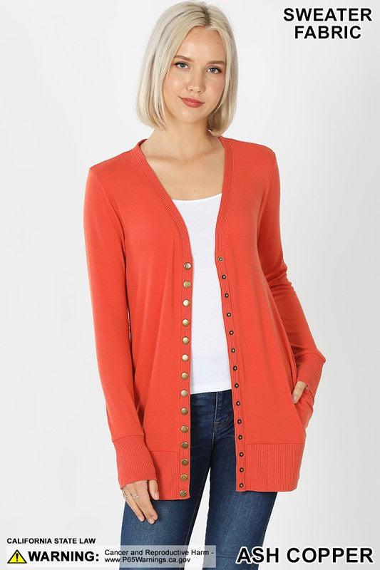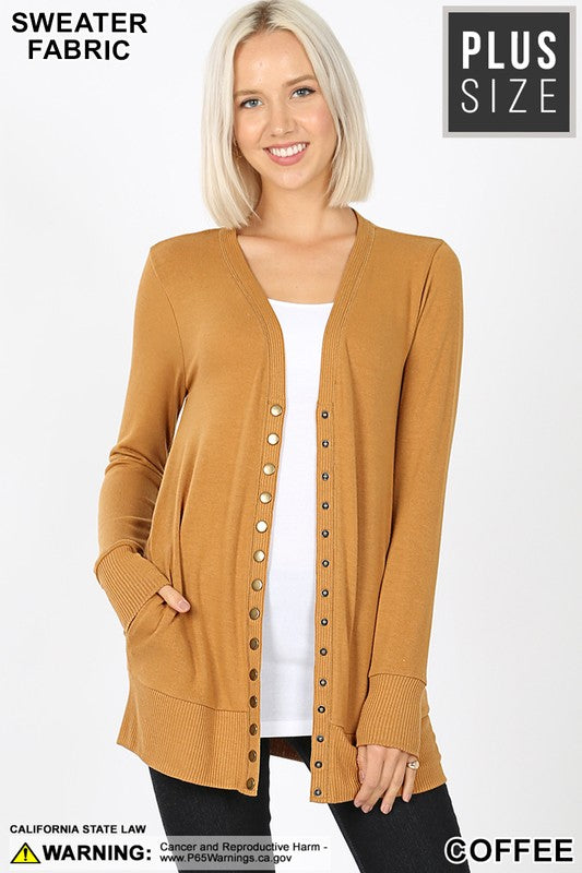 SNAP BUTTON SWEATER CARDIGAN WITH SIDE POCKETS - RIBBED DETAIL ON NECKLINE, BOTTOM, AND SLEEVE.