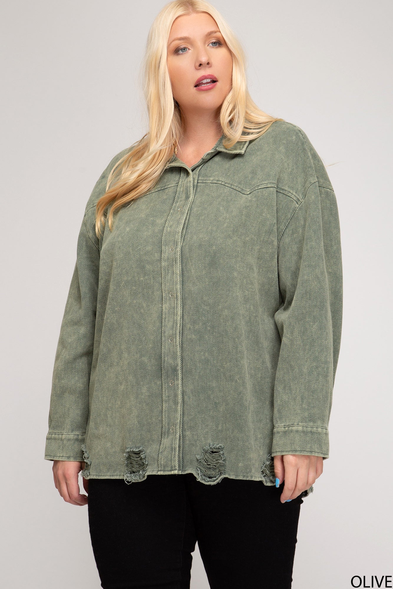 LONG SLEEVE DENIM JACKET WITH DISTRESSED HEM AND GARMENT WASH FINISHS: 100%COTTON WOVEN JACKET