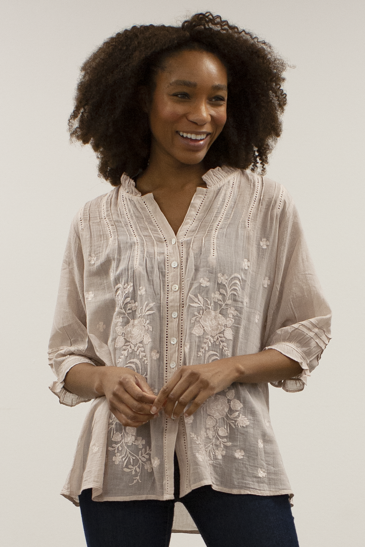 • Features: Vintage-inspired embroidery, ruffle v-neckline, button down, 3/4 length loose elasticized cuffs, A-line cut with split sides, and pintucking at the bodice,