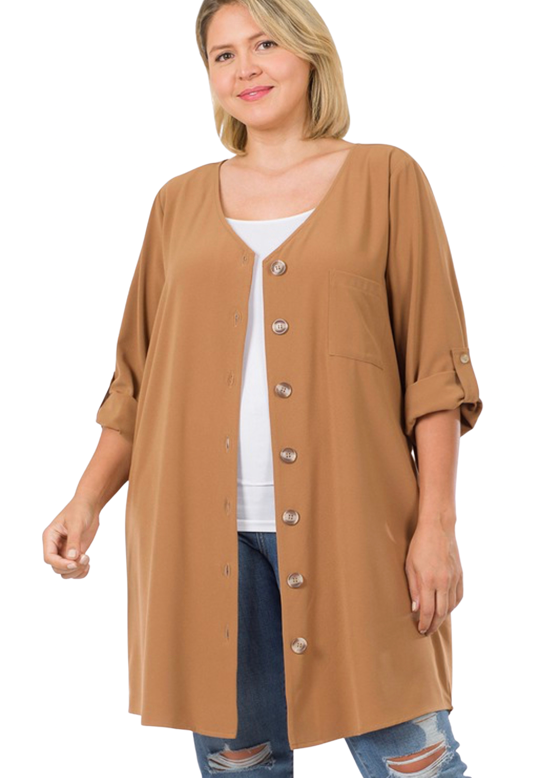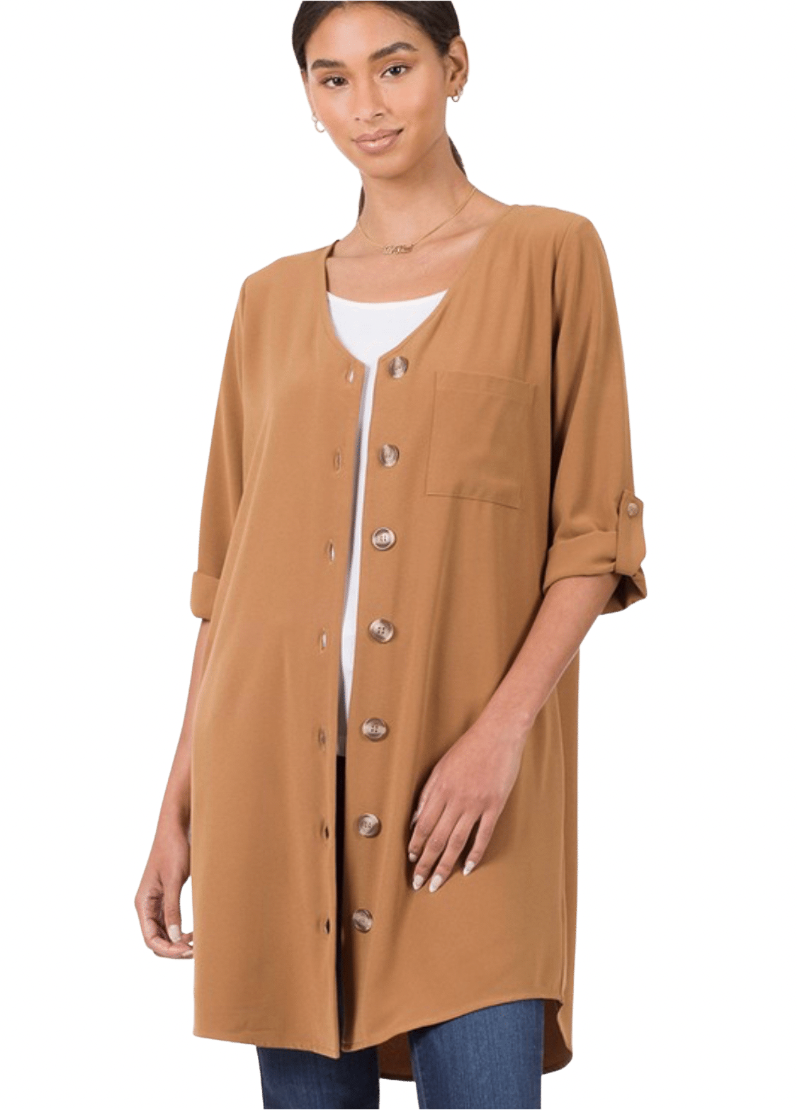 We LOVE the versatility of this piece! Wear it open as a jacket, or button it up and wear as a cute dress! Either way, you'll rake in all the compliments!