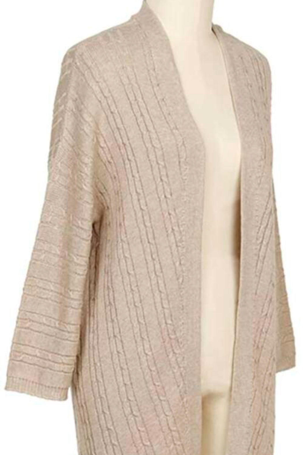 This beautiful 3/4 sleeve cream cardigan is the perfect length for any outfit.