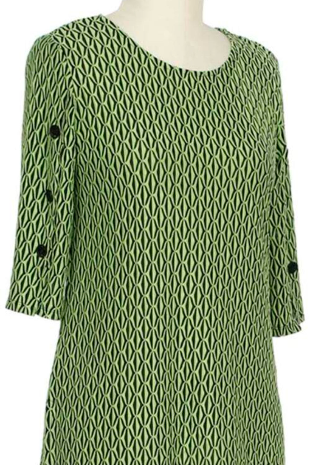 This 3/4 sleeve novelty woven top has a unique 3 button detail on the arm. Features a crew neck line and side slits. This top has a subtle black stripe like textured detail and will be a wonderful addition to your spring wardrobe. COMES IN CORAL ONLY