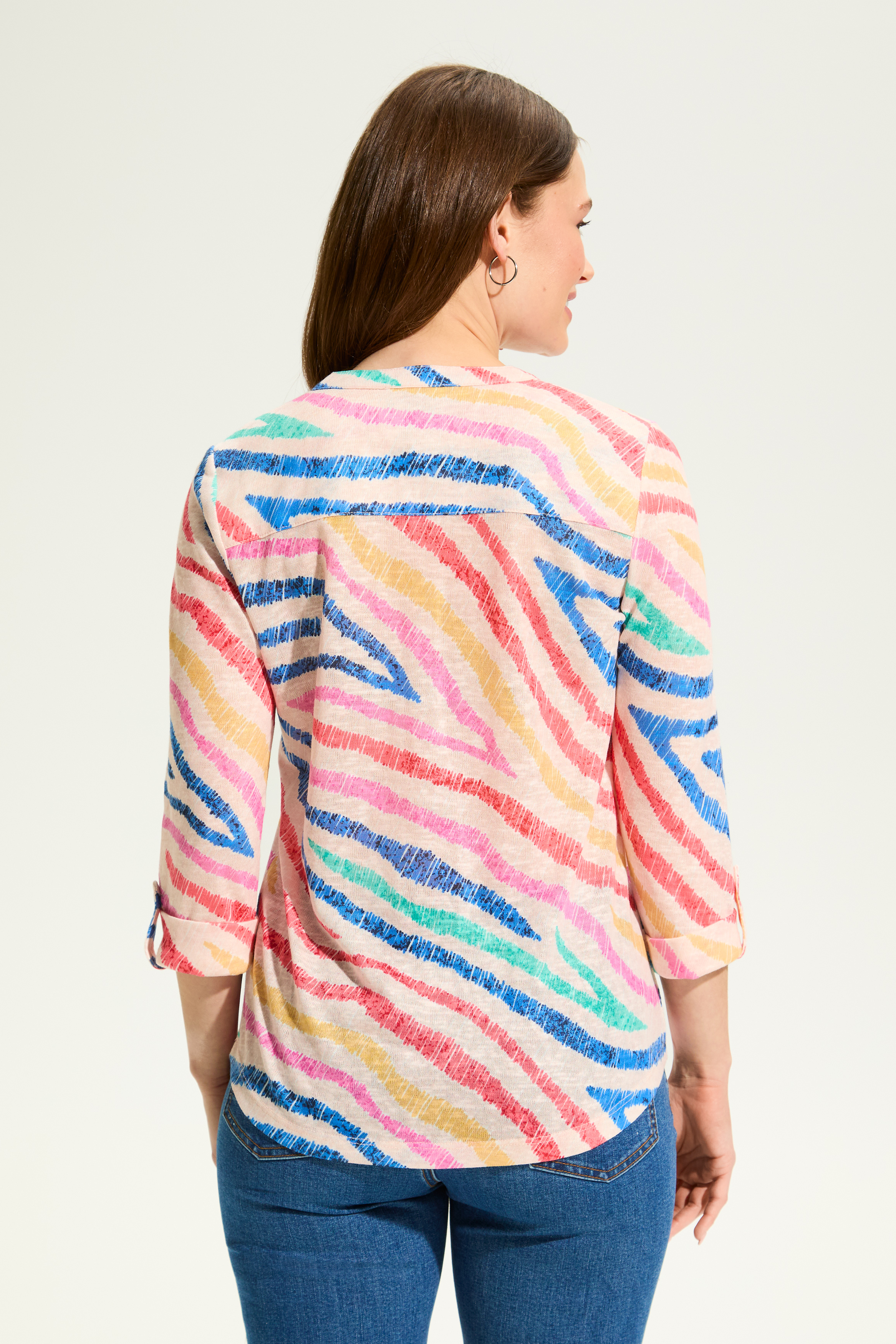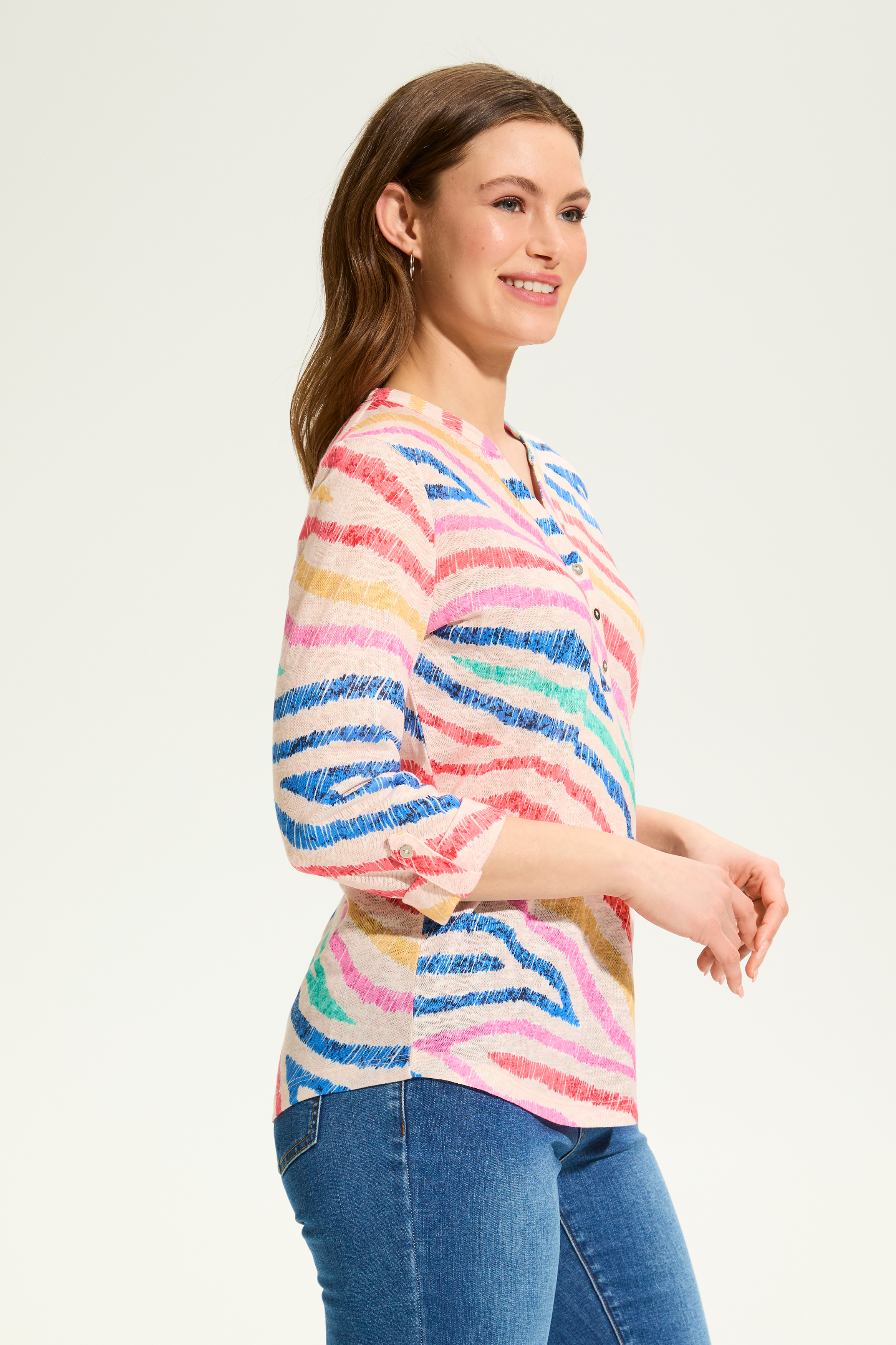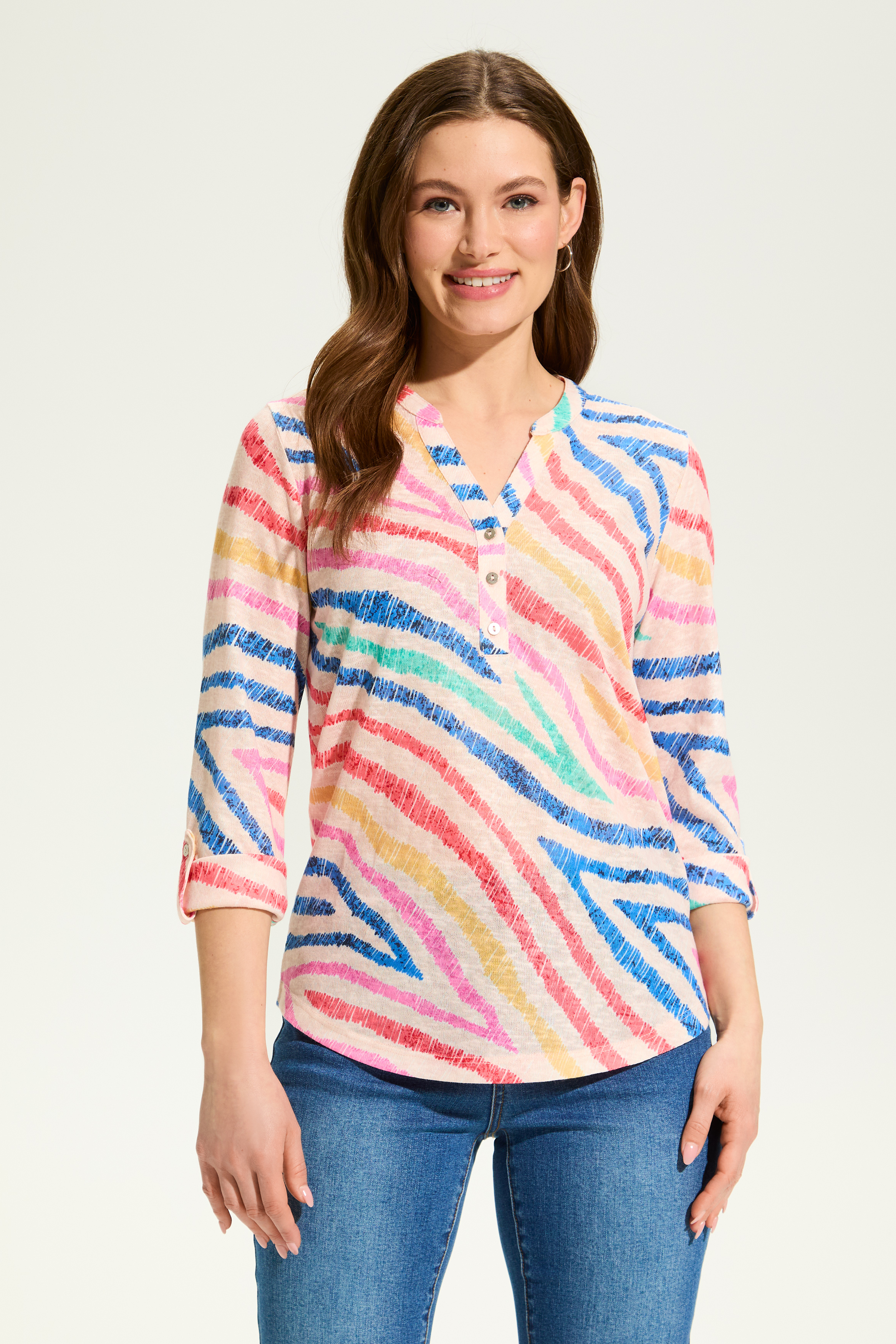 Henley neckline 3/4 sleeves w/ tab up option Length 26” Smooth printed jersey