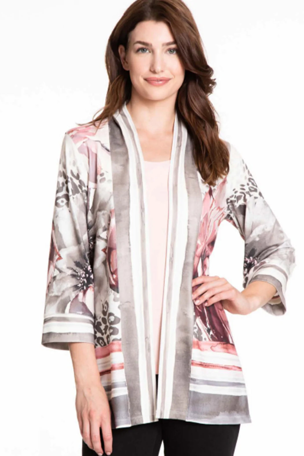 This placement print kimono has a beautiful colorway. An open front and drop shoulders make it easy to slip on over a basic tank, top, or even turtleneck. A stripe border matches the stripe pockets and stripe cuffs.