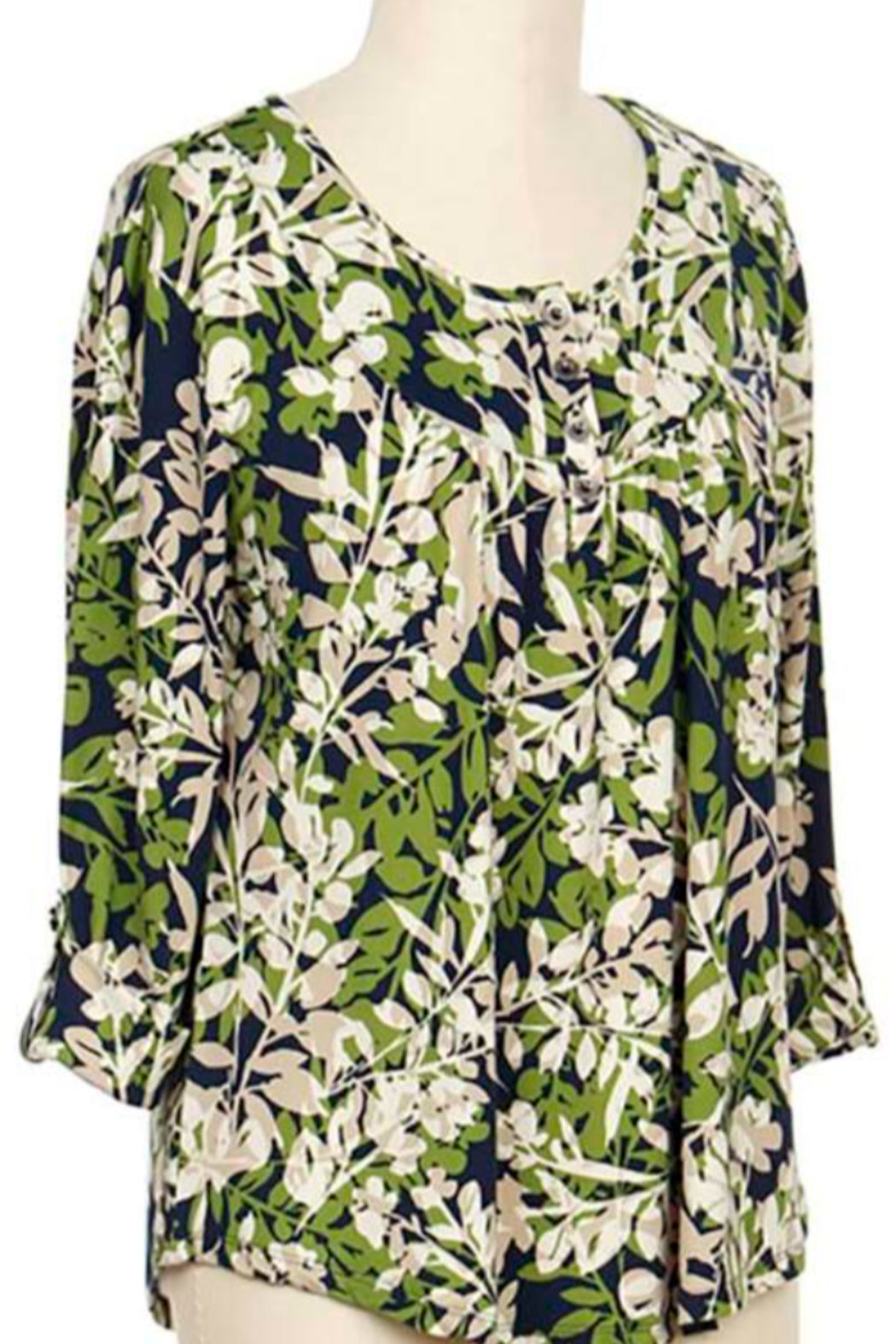 A relaxed fit accented by flattering rounded neckline with four small buttons. Mid length high low cut gives coverage even with the most fitted of pants. Easy care material and lightweight enough to either layer or wear this stunning piece solo.