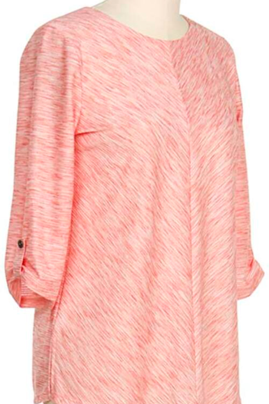 This 3/4 sleeve knit top features a rounded neck, straight hemline with side slits, and button detail on sleeve.