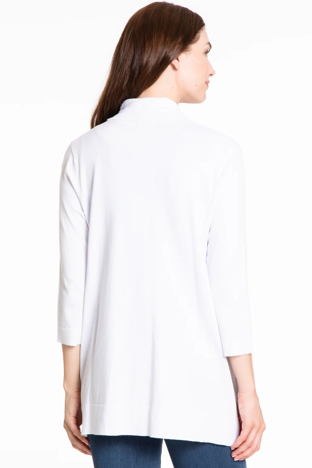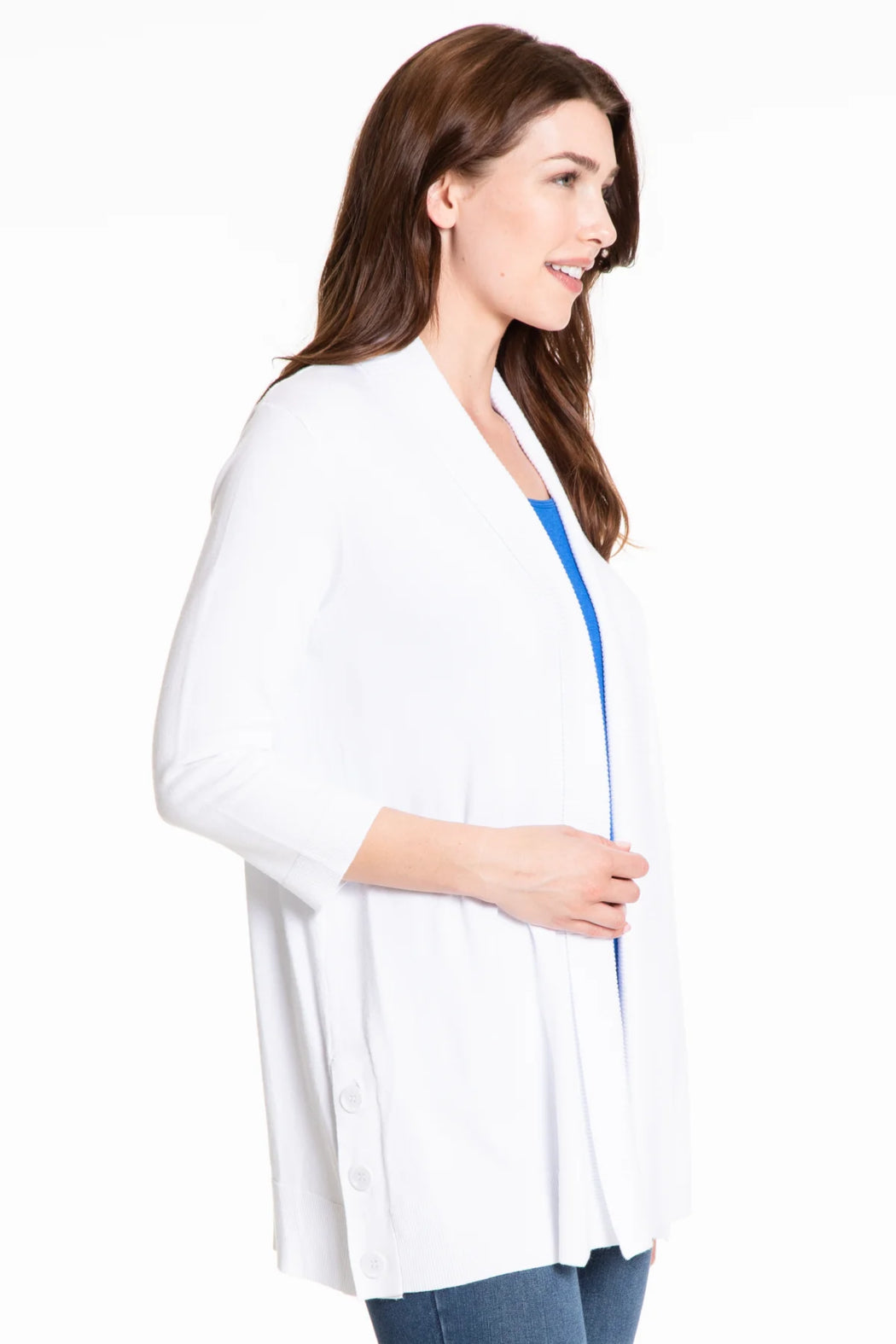 The beautiful open cardigan features a 3/4 sleeve, rib collar, and side detail buttons.