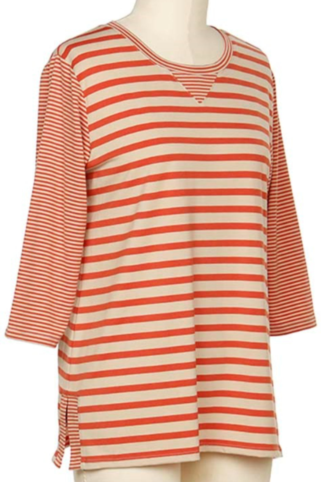 This 3/4 sleeve stripe top has comfort and style written all over it. It features a detailed side slit.