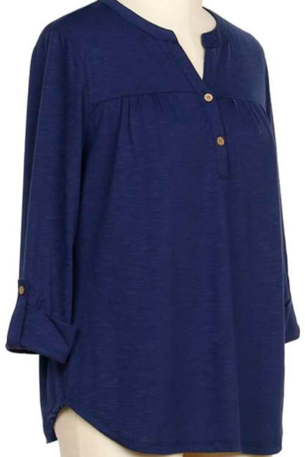 This pamona solid placket features 3/4 roll tab sleeves, rounded hemline, and front button detail.