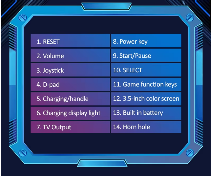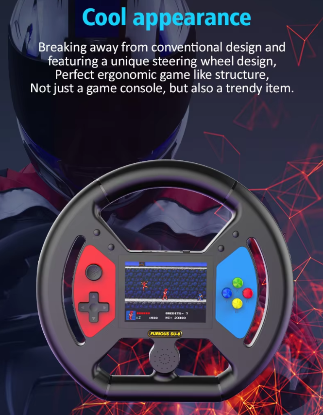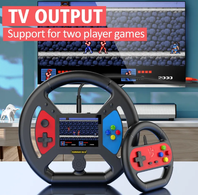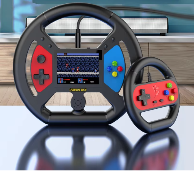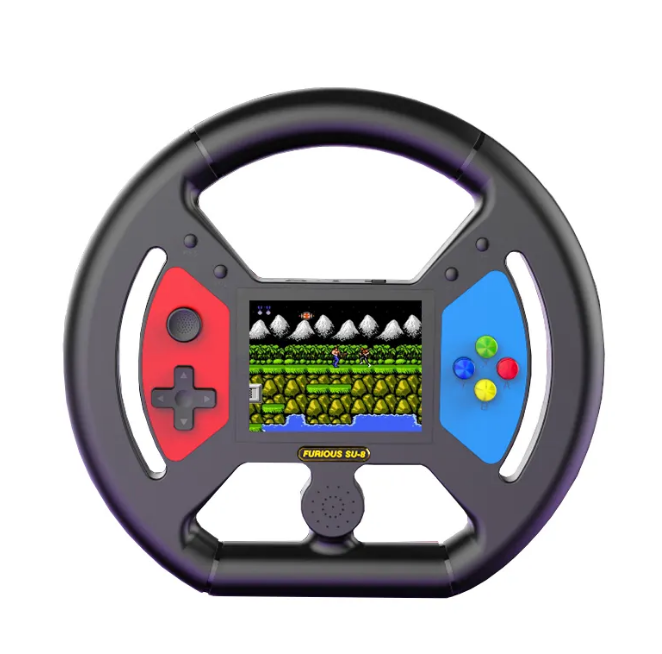 Disruptive cognition game console with a car steering wheel design. Features: color screen, TV output, 999-in-1 games, joystick, and long battery life. The 3.5-inch HD color screen provides clear, saturated game graphics with dazzling or dragging shadows, ensuring long-term gaming without eye strain. Built-in 1200mAh polymer battery offers over 6 hours of play on a full charge. TV output supports large screen display.