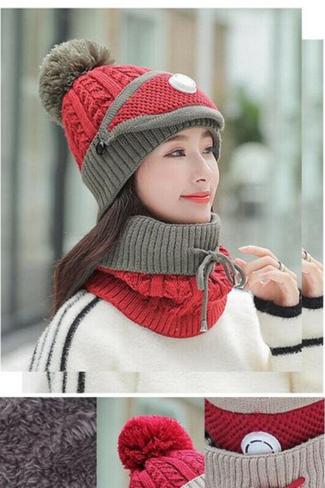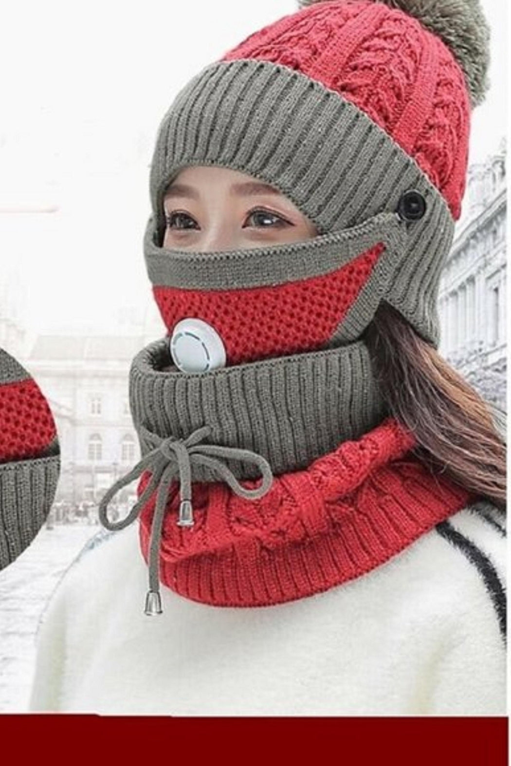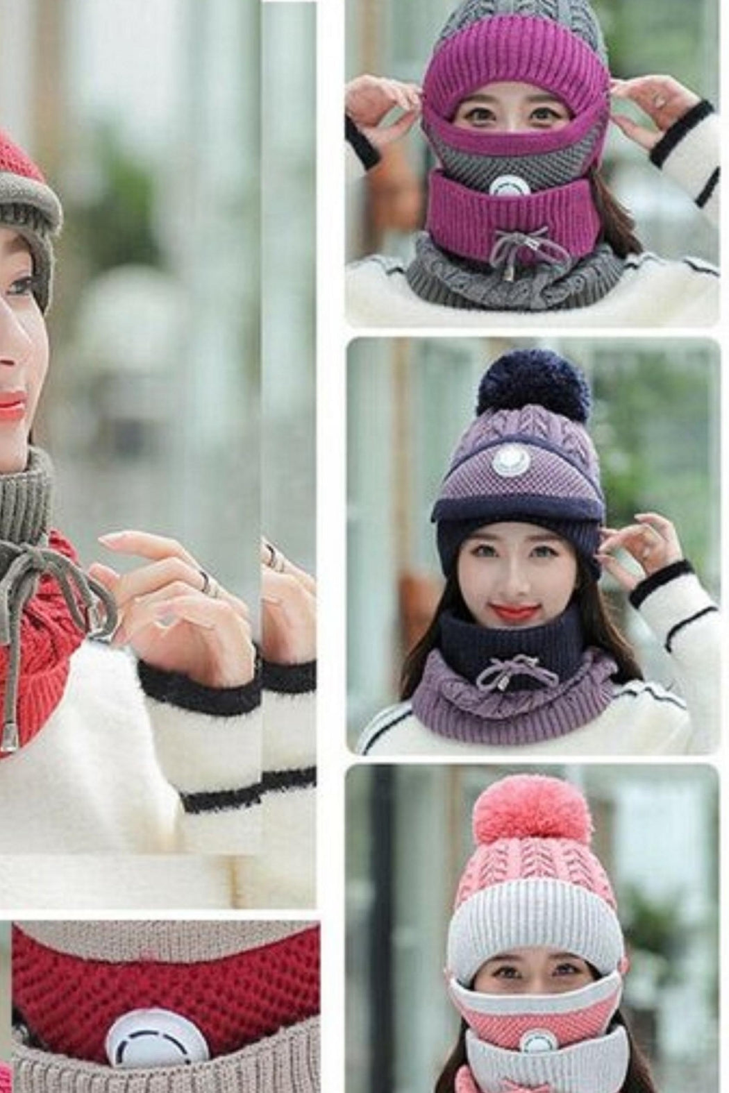 Women's Pom Pom Beanie + Neck Scarf + Mask combo - Perfect winter protection.
