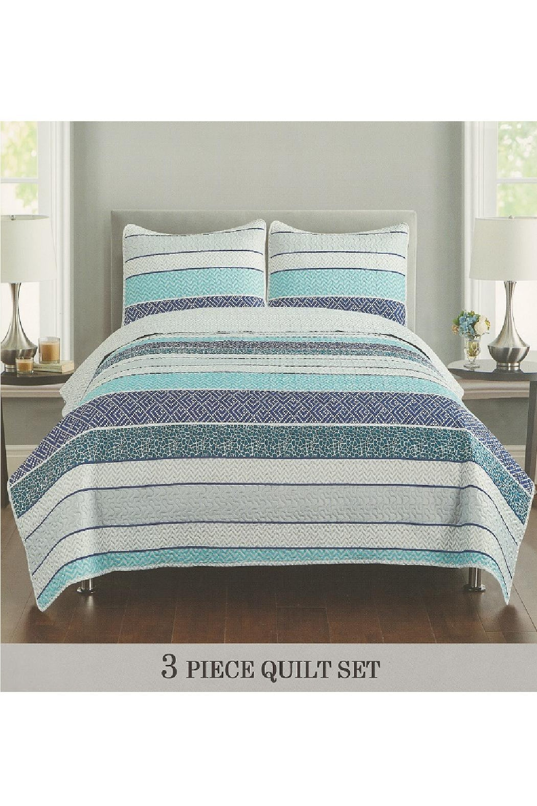 3 Piece Quilted Bedspread Set - White Blue Green Gray Stripes Full/queen & King Size