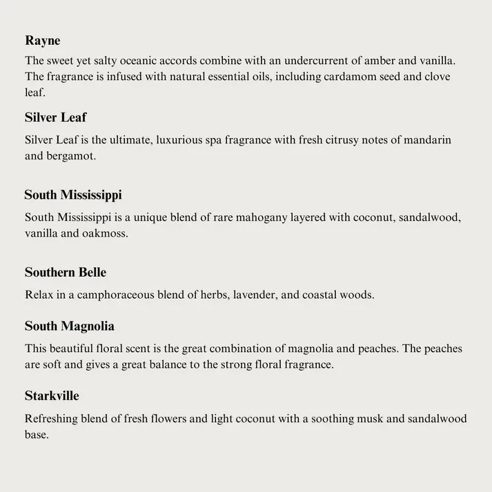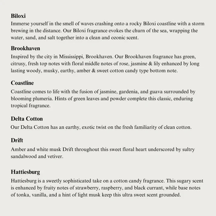 Premium fragrances inspired by the south. Customized soy-blend wax blended and poured in Gulfport, MS. Vessel can be recycled or reused as part of your home decor. Women owned and operated small business.