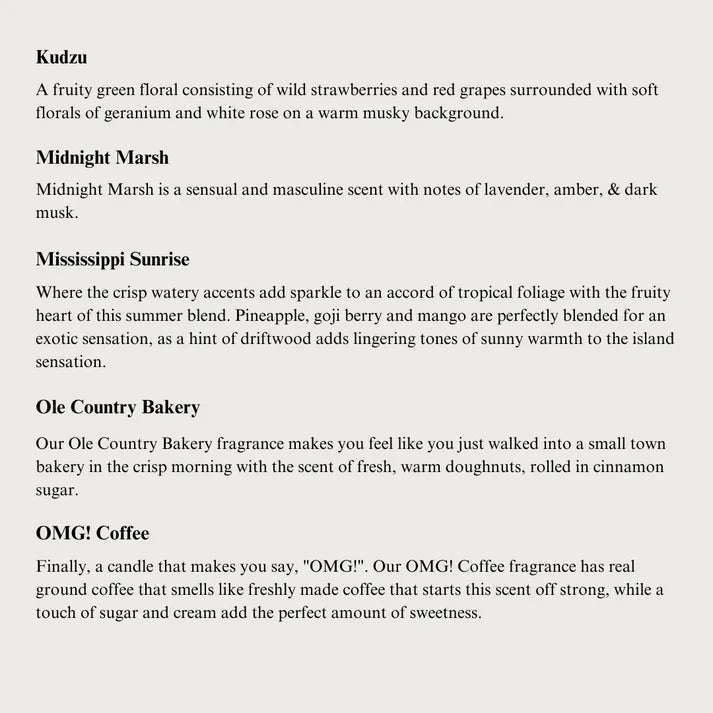 Mississippi Candle Co. is a very small women owned and family operated business. We take pride in creating scents Clean fragrance oils that exclude cancer causing ingredients.