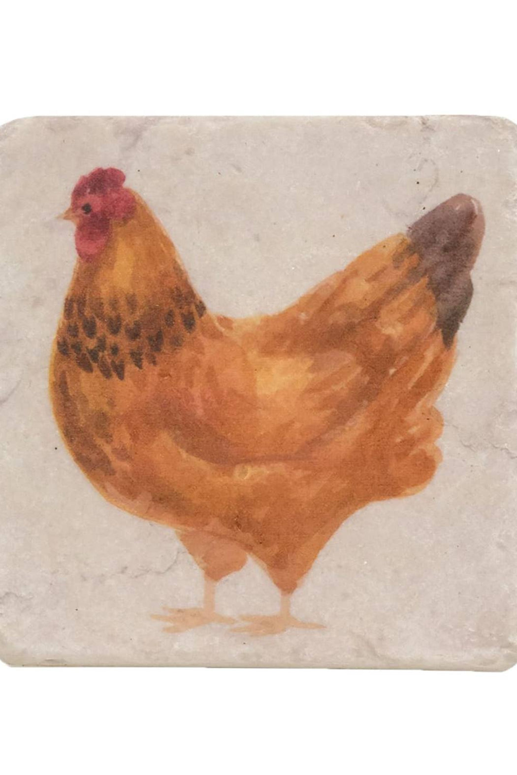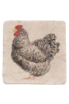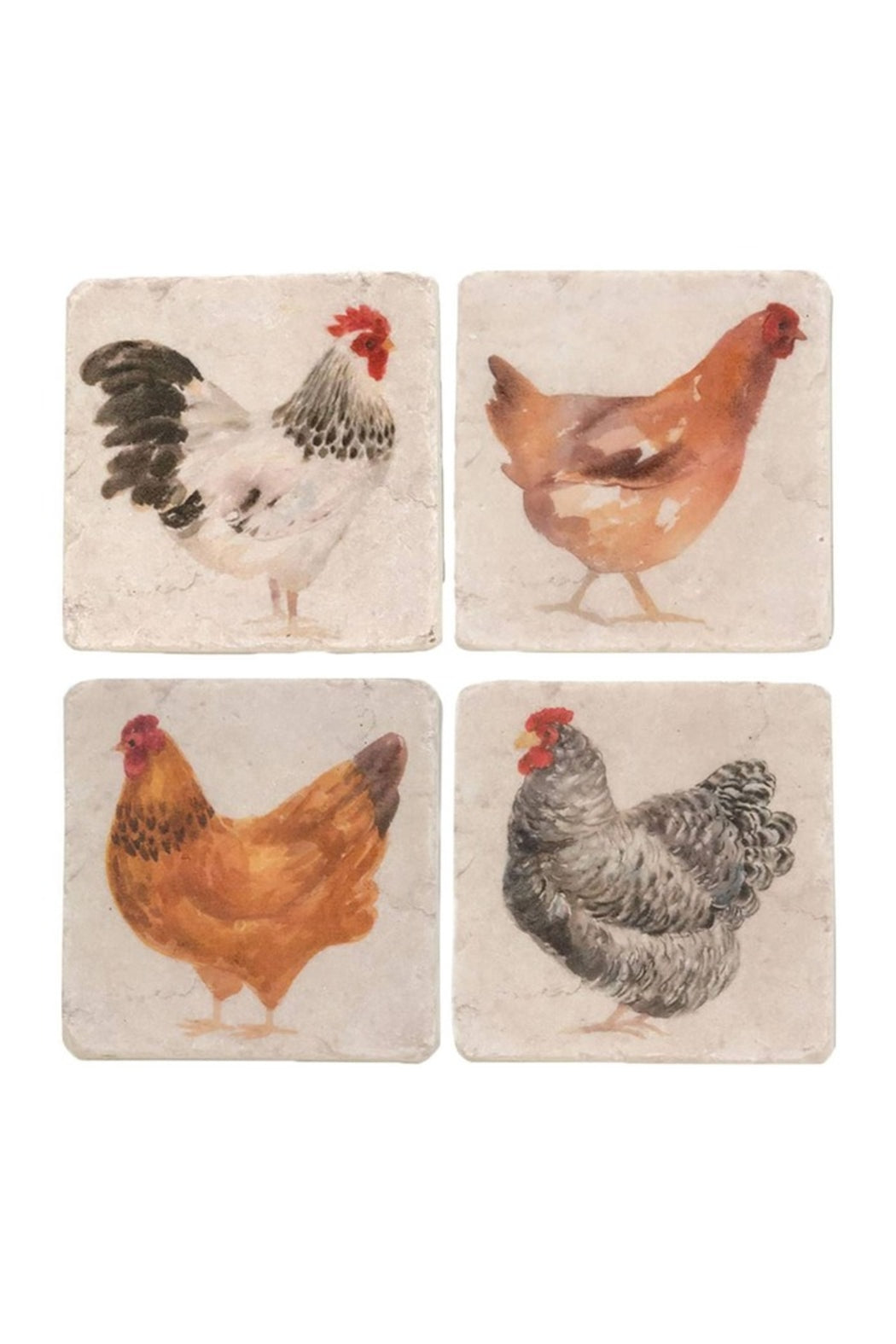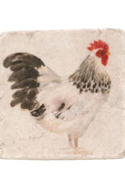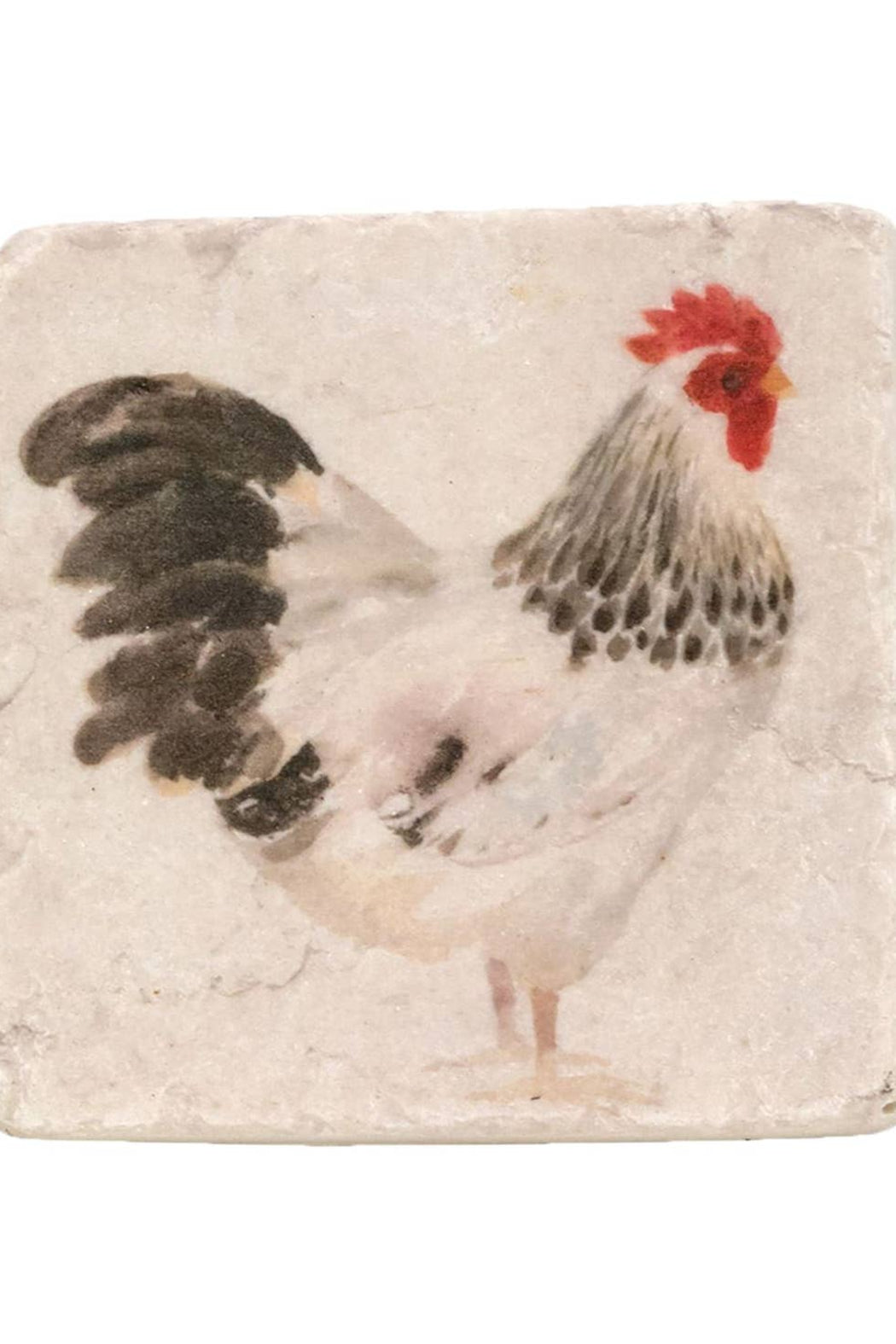 4/Set Rooster Resin Coasters sells as a set of resin coasters with four unique rooster illustrations on a textured, granite-like background. Each has a cork base for stability and scratch prevention and they are fit for use in any room. Measures 3.75" square by .375" high.