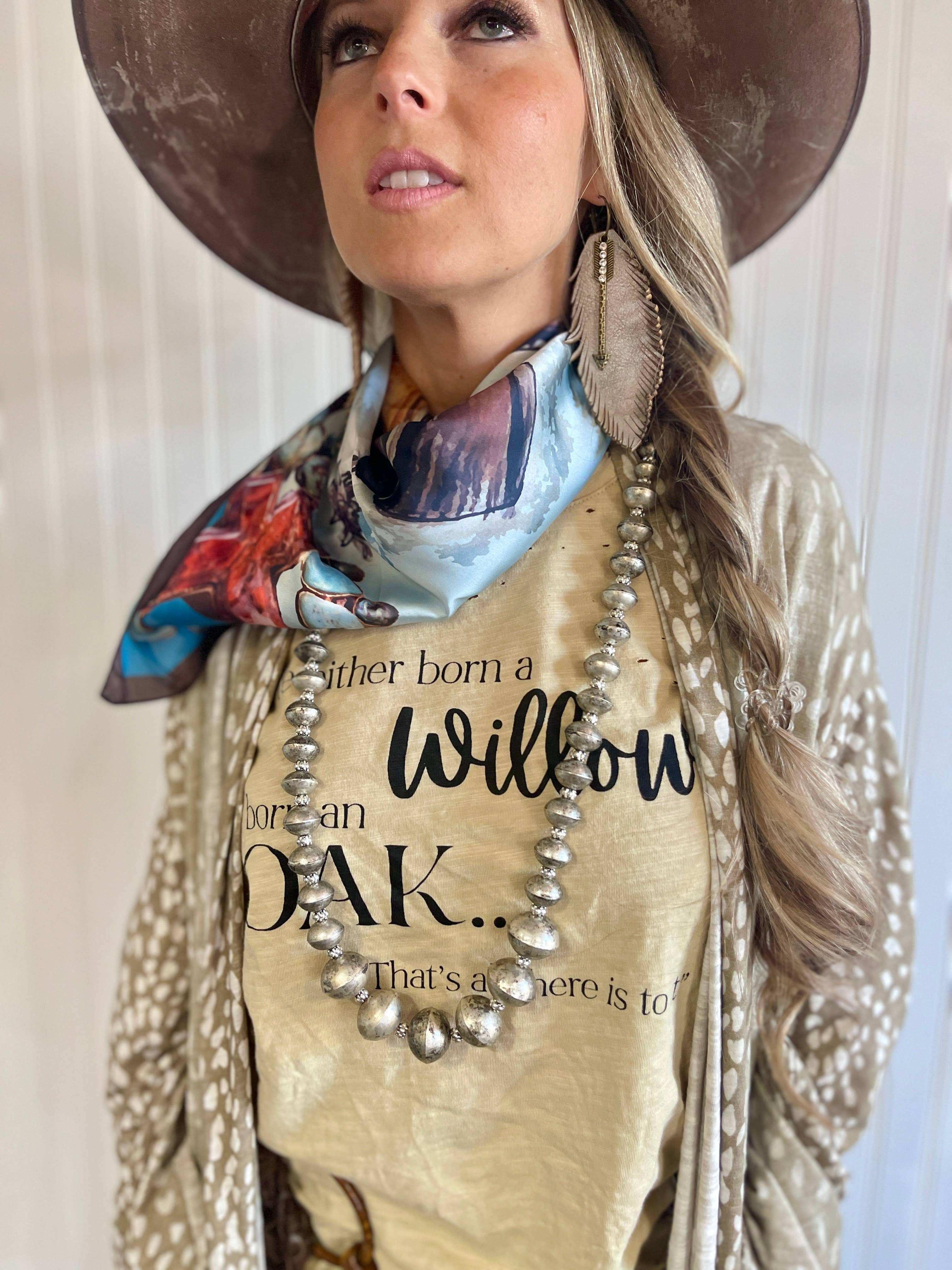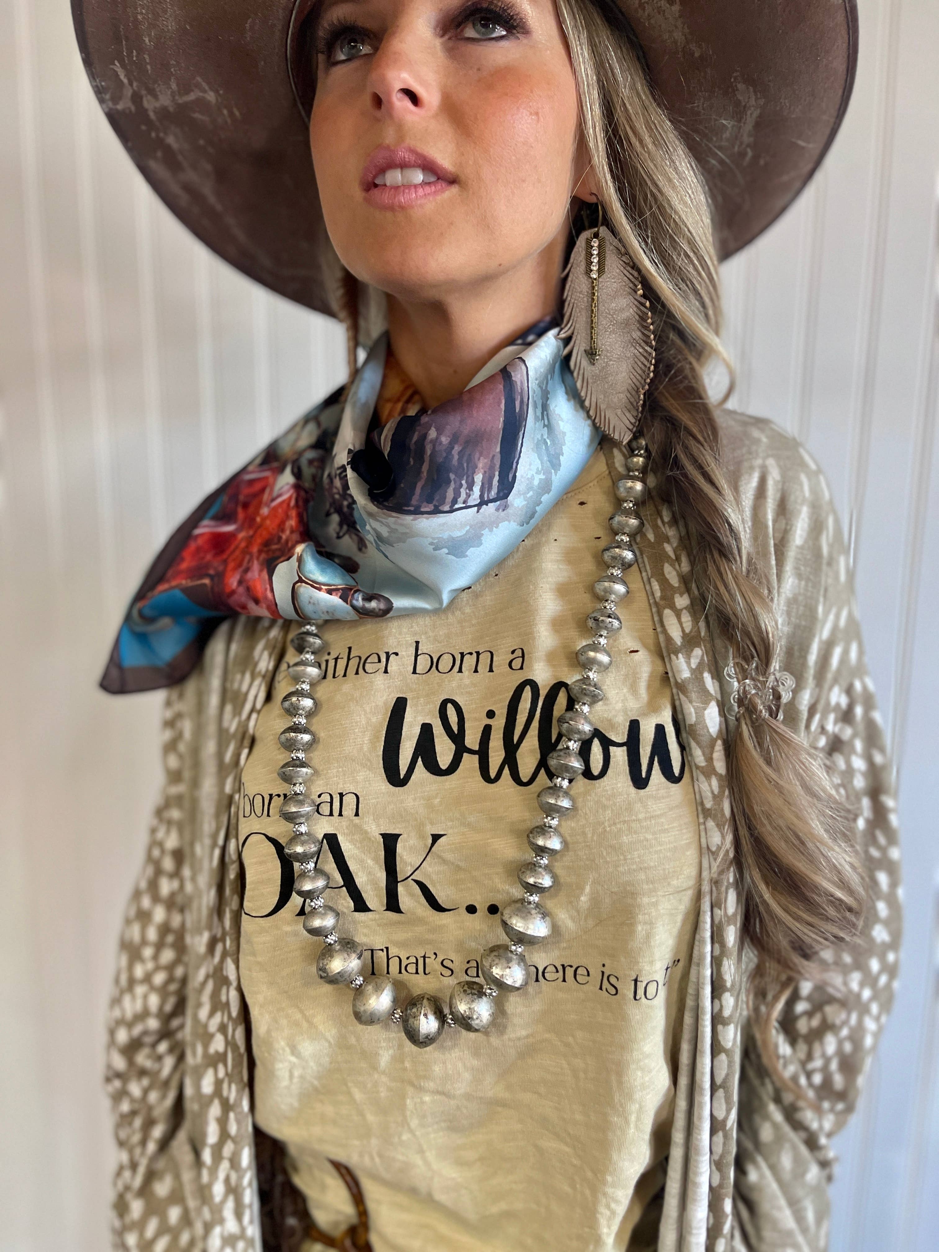 "You are either born a willow or born an oak"....Which one are you? 100% cotton, this high low shirt is made to fiit almost all sizes. Long slit on side so it can be tied for a different look. Plenty long to cover all we need to cover!