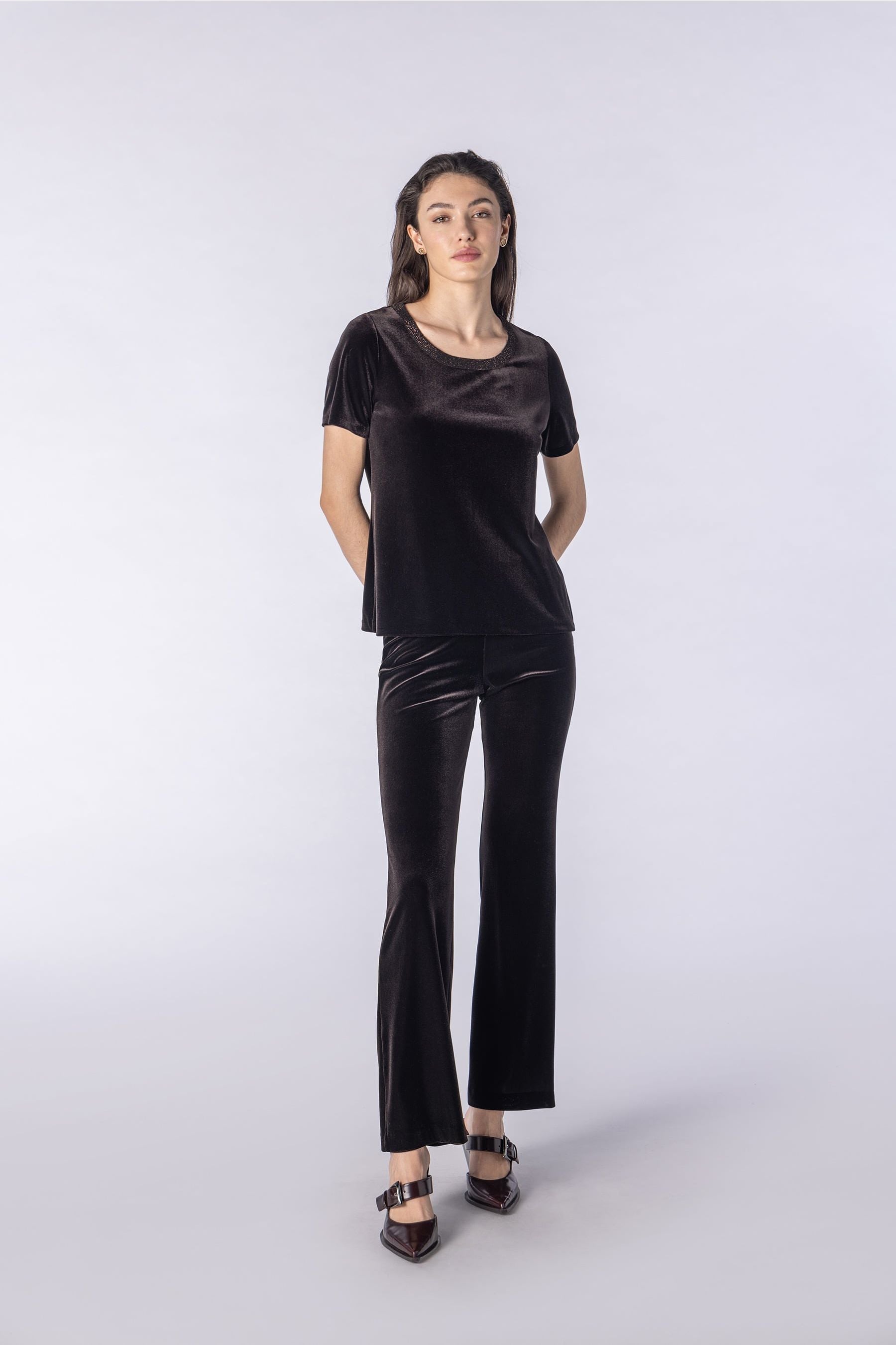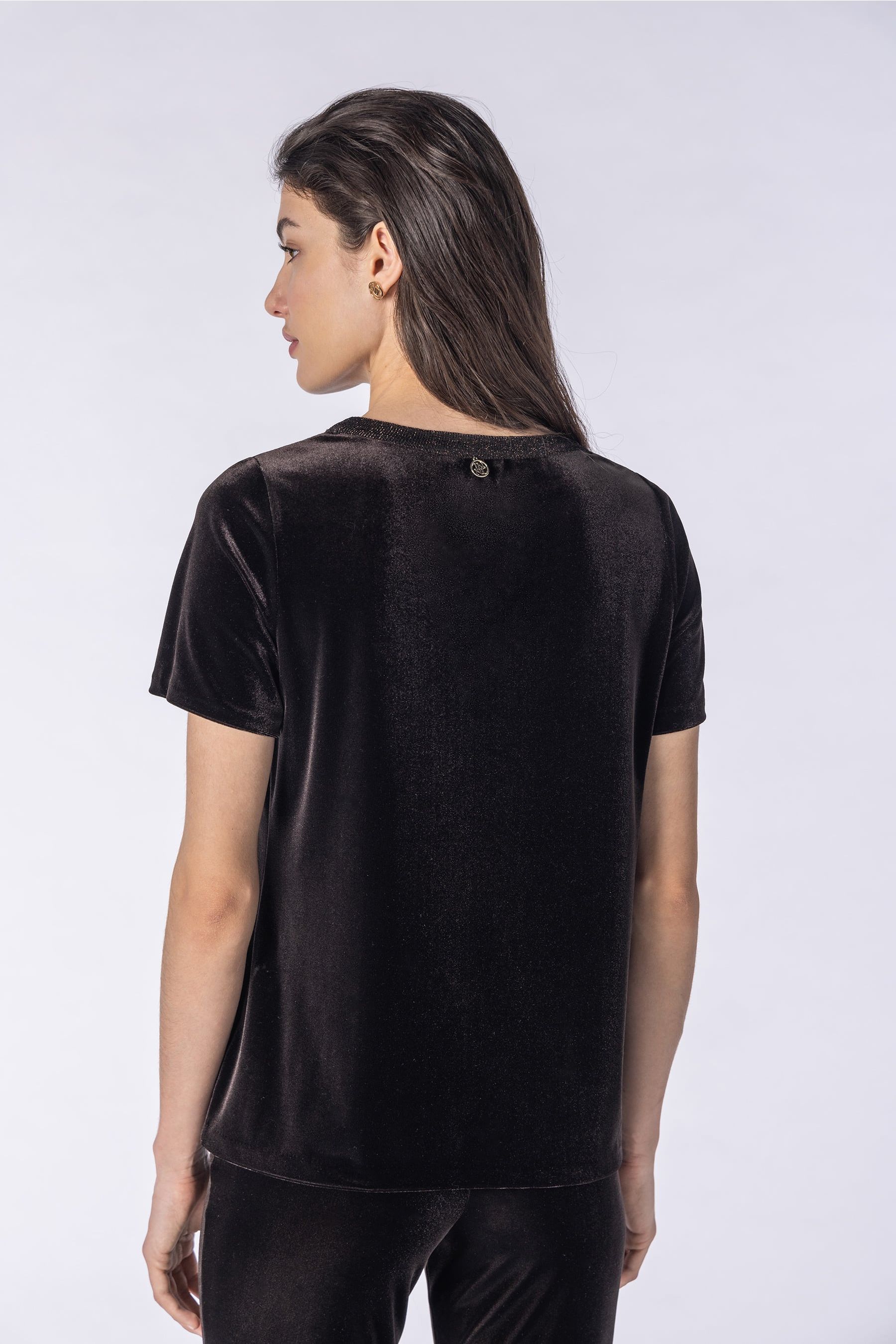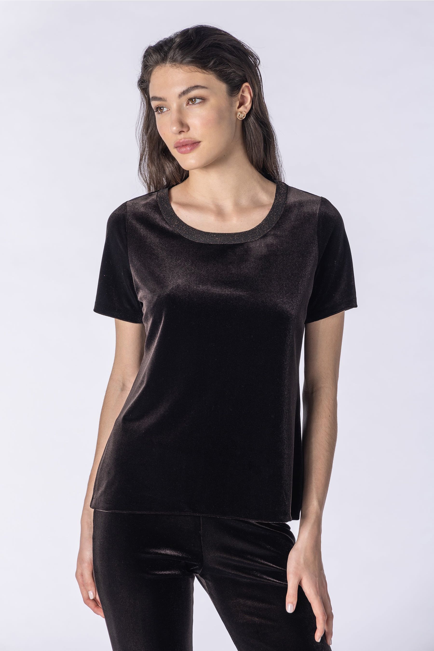 It's cut from a stretch-jersey velvet in dark-brown 'Espresso' shade, detailed with bronze lurex-knit trimming. This T-shirt has a classic crew neckline, detailed with striped-knit trimming.