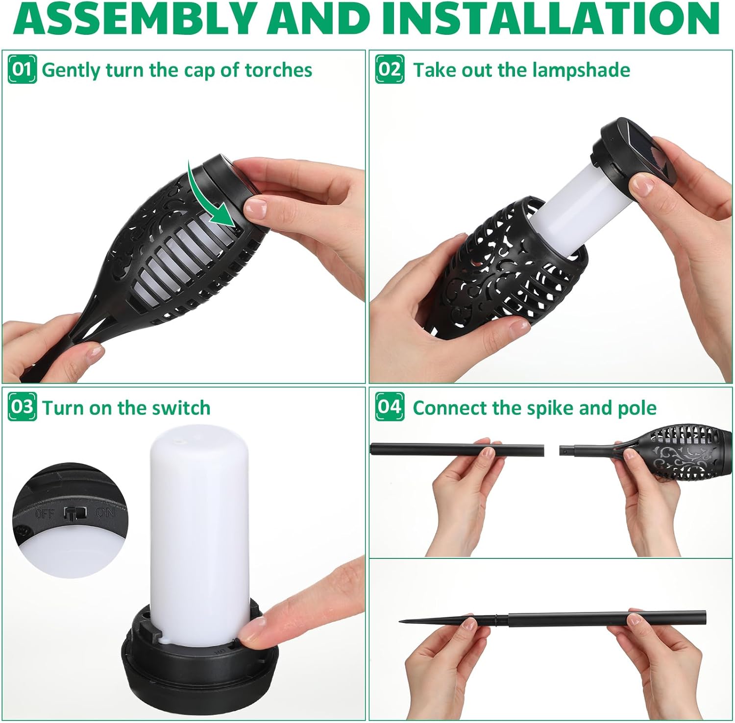 - Effortless Installation, Wire Free: say goodbye to tangled wires and time consuming installations; These solar flame lights are designed for easy, wire free installations; Simply stake the torches into the ground and let them bask under the sun's light during the day