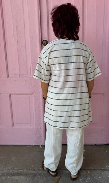 This linen striped top will keep you stylish and cool on a warm summer day. It's lightweight linen fabric, large abalone button, and navy blue stripe pattern is perfect for any occasion. Wear it with a colorful shell underneath for a fun pop of color!