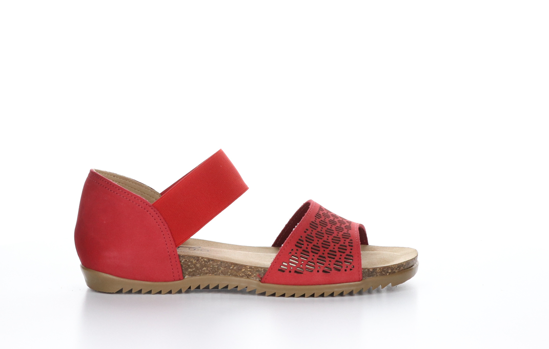 Laser-cut perforations bring breezy charm to a slip-on sandal featuring a contoured footbed atop a cork-cushioned mid-sole for all-day walking comfort.